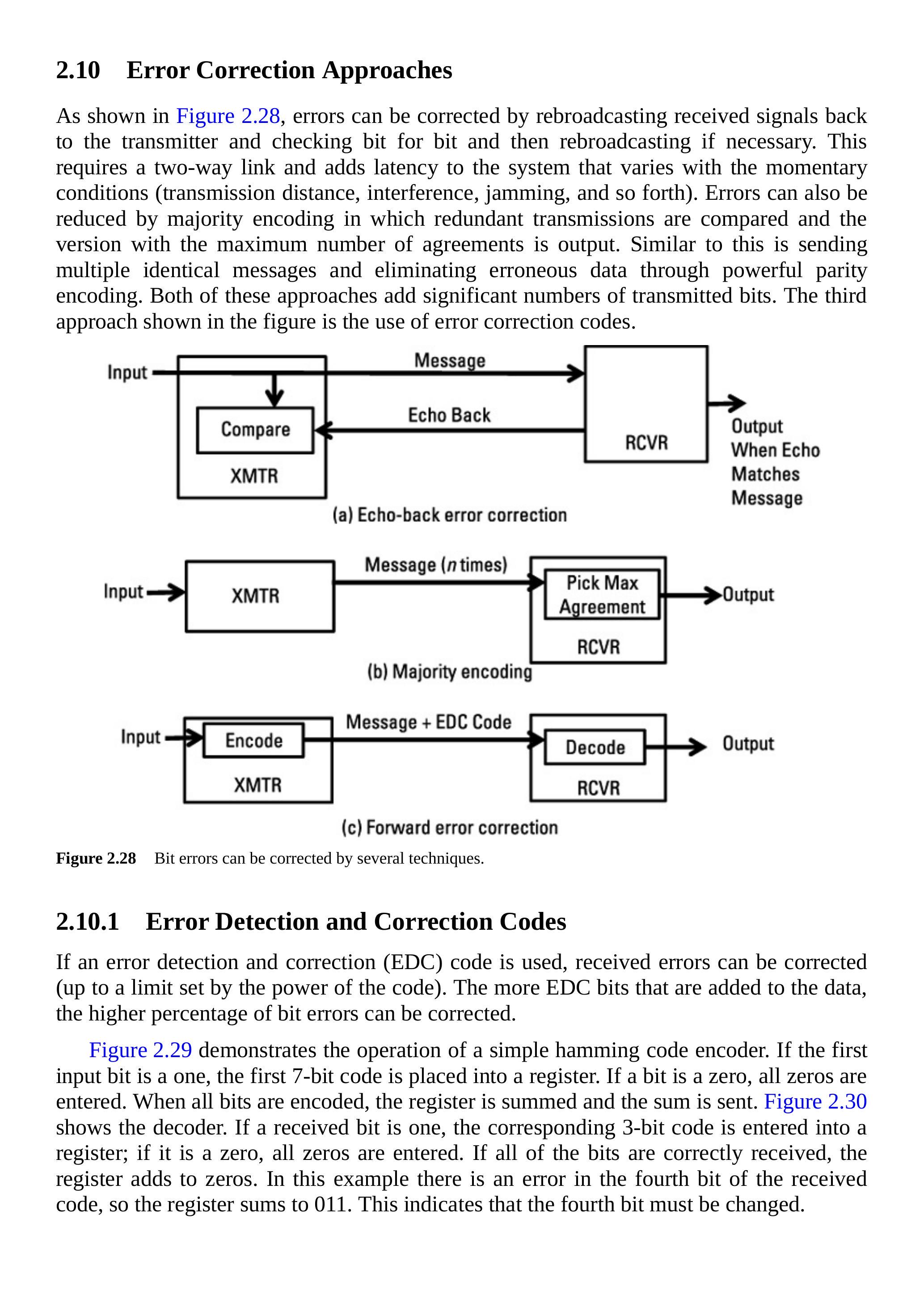 如图2.28所示,可以通过将接收信号回传至发射机并逐比特核对,再在必要时重传来修正错误。这需要双向链路,并会因传输距离、干扰、干扰压制等瞬时条件而增加系统时延。还可以通过多数编码来降低错误,即比较冗余传输并输出一致性最多的版本。类似的方法是发送多个相同消息,并通过强大的奇偶校验编码消除错误数据。这两种方法都会增加大量的传输比特。第三种方法是使用纠错编码。