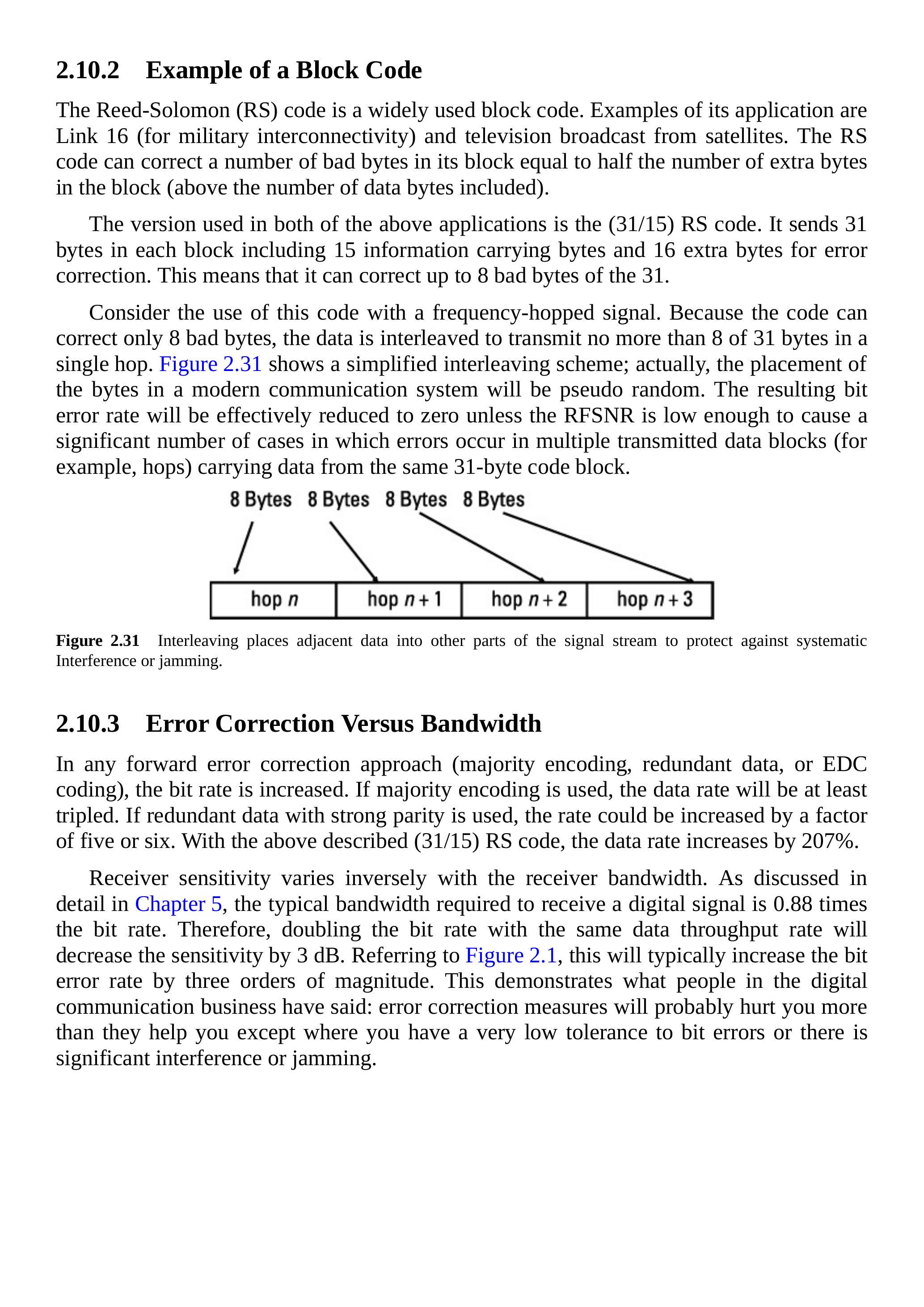 考虑该码在跳频信号中的使用。由于其最多可纠正8个错误字节,因此数据需交织,使得单次跳频传输的31字节中不会超过8字节来自同一个码块。图2.31展示了简化的交织方案;实际上,现代通信系统中字节位置是伪随机的。除非RFSNR足够低,导致多个数据块(例如跳频期间)的错误叠加,否则其比特错误率可有效降低至零。