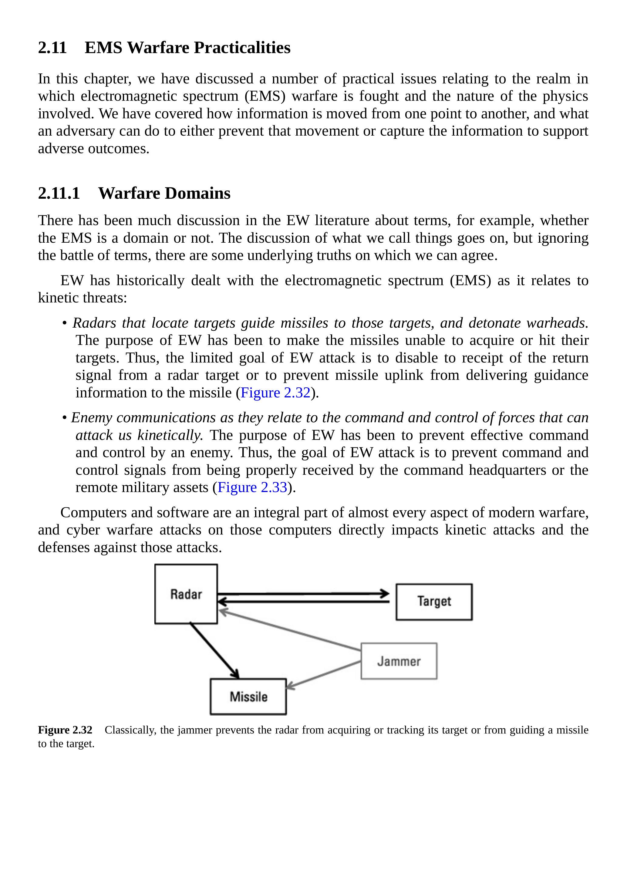 - 雷达用于定位目标、引导导弹打击这些目标并引爆弹头。EW的目的在于使导弹无法获取或击中目标。因此,EW攻击的有限目标是阻止雷达接收机获取目标回波,或阻止导弹上行链路向导弹传递制导信息(见图2.32)。