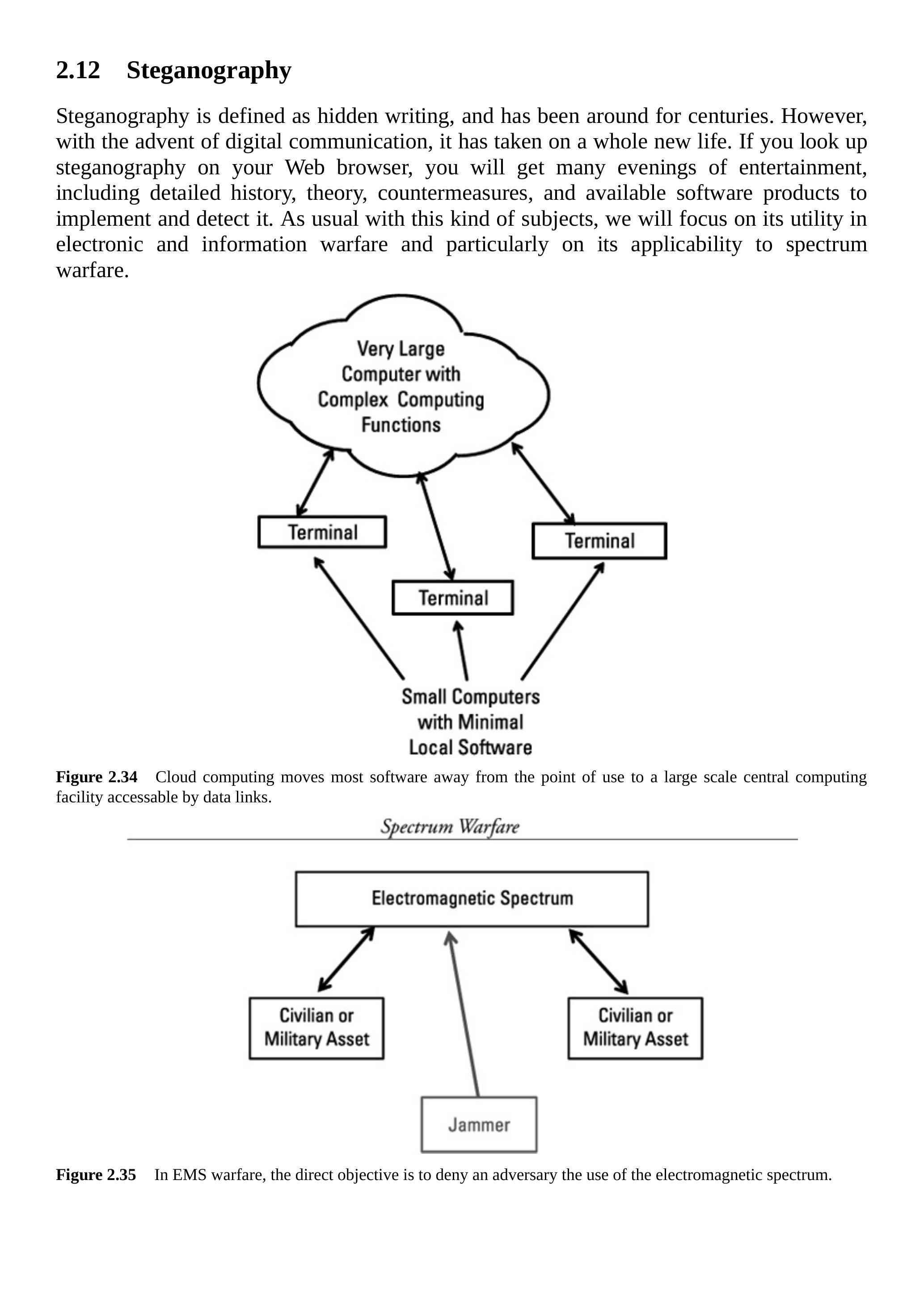隐写术直接作用于我们发送的信息,无论是硬拷贝还是电子传输。它通过看似无关的数据掩盖秘密消息,如图2.37所示,使敌人甚至不知道我们在进行重要(通常是军事)通信。这实际上提供了传输安全。加密的作用如前所述:一旦敌人发现了我们的隐藏消息,它仍能保护我们的信息。然而,加密消息显示的是随机字母或比特,明显表明我们在隐藏某些东西。这会告诉敌人我们正在传递重要信息,并可能促使其进行分析并最终恢复我们的信息。而隐写术若成功,则剥夺了敌人的这一作战优势。