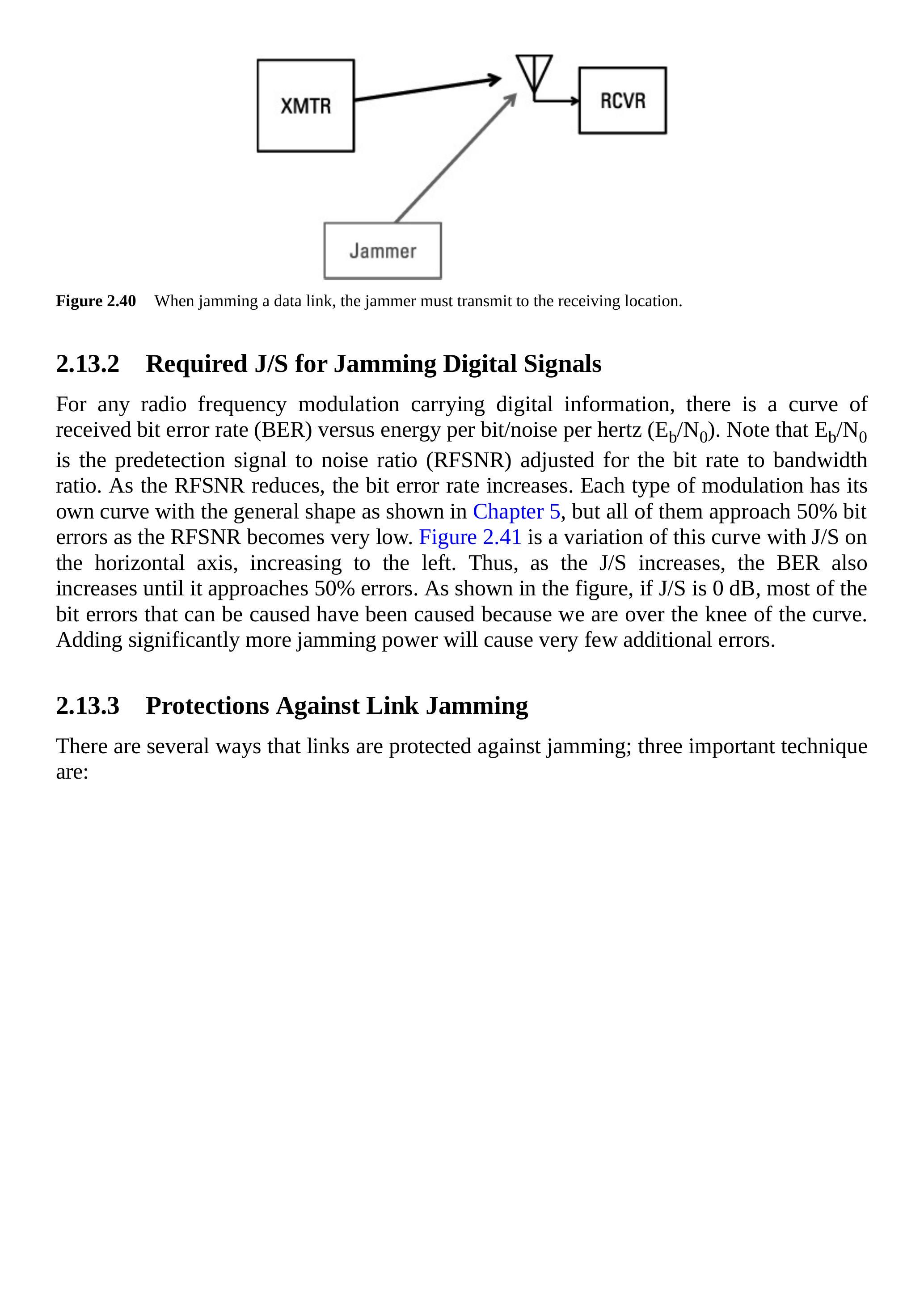 - 干扰的对象是接收机,而不是发射机。任何干扰都是让不希望出现的信号以足够的功率进入目标接收机,从而使其无法正确恢复正在试图接收的信息(见图2.40)。