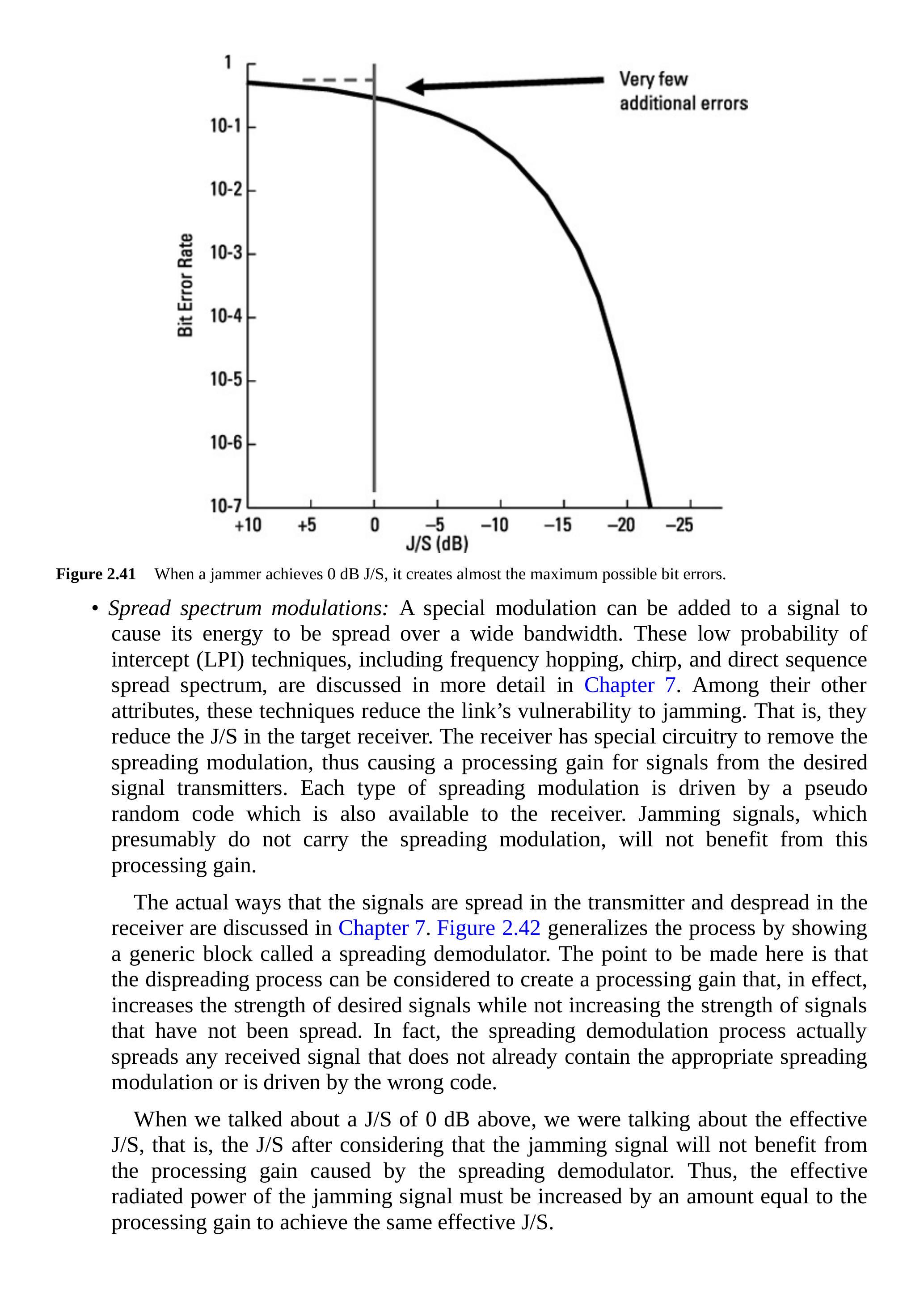 对于承载数字信息的任意射频调制,接收比特错误率(BER)与每比特能量/每赫兹噪声(\(E_b/N_0\))之间存在曲线关系。注意,\(E_b/N_0\)是检测前信噪比(RFSNR),并根据比特率与带宽比进行调整。随着RFSNR降低,BER升高。每种调制都有自己的曲线,其形状如第5章所示,但当RFSNR非常低时,所有曲线都会趋向于50%的比特错误率。图2.41是该曲线的一个变体,其中横坐标为J/S(向左增加)。因此,随着J/S增加,BER也增加,直至接近50%的错误率。如图所示,当J/S=0 dB时,几乎所有可能产生的比特错误都已出现,因为此时已经越过了曲线的拐点。再增加显著的干扰功率将几乎不会造成额外错误。
