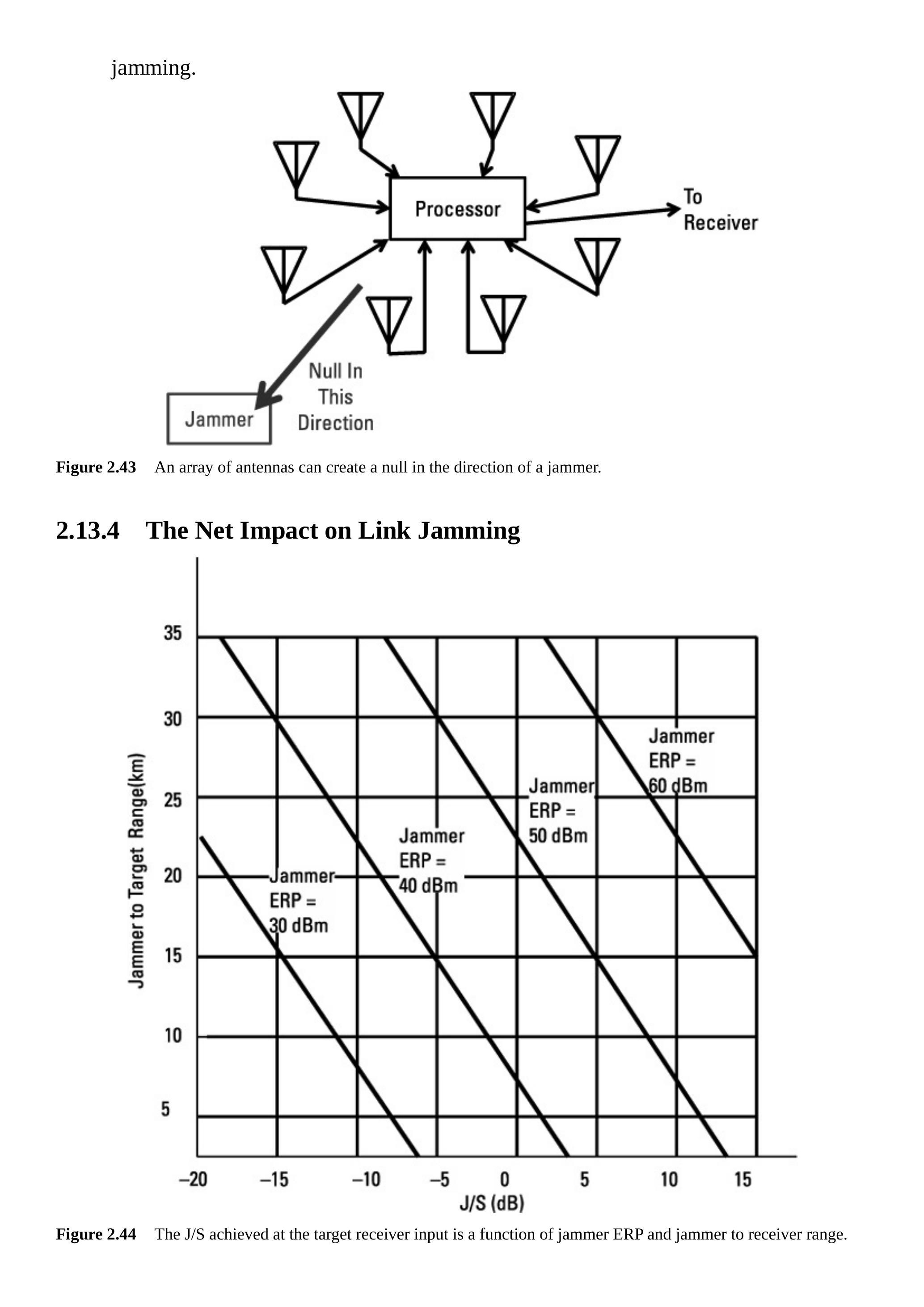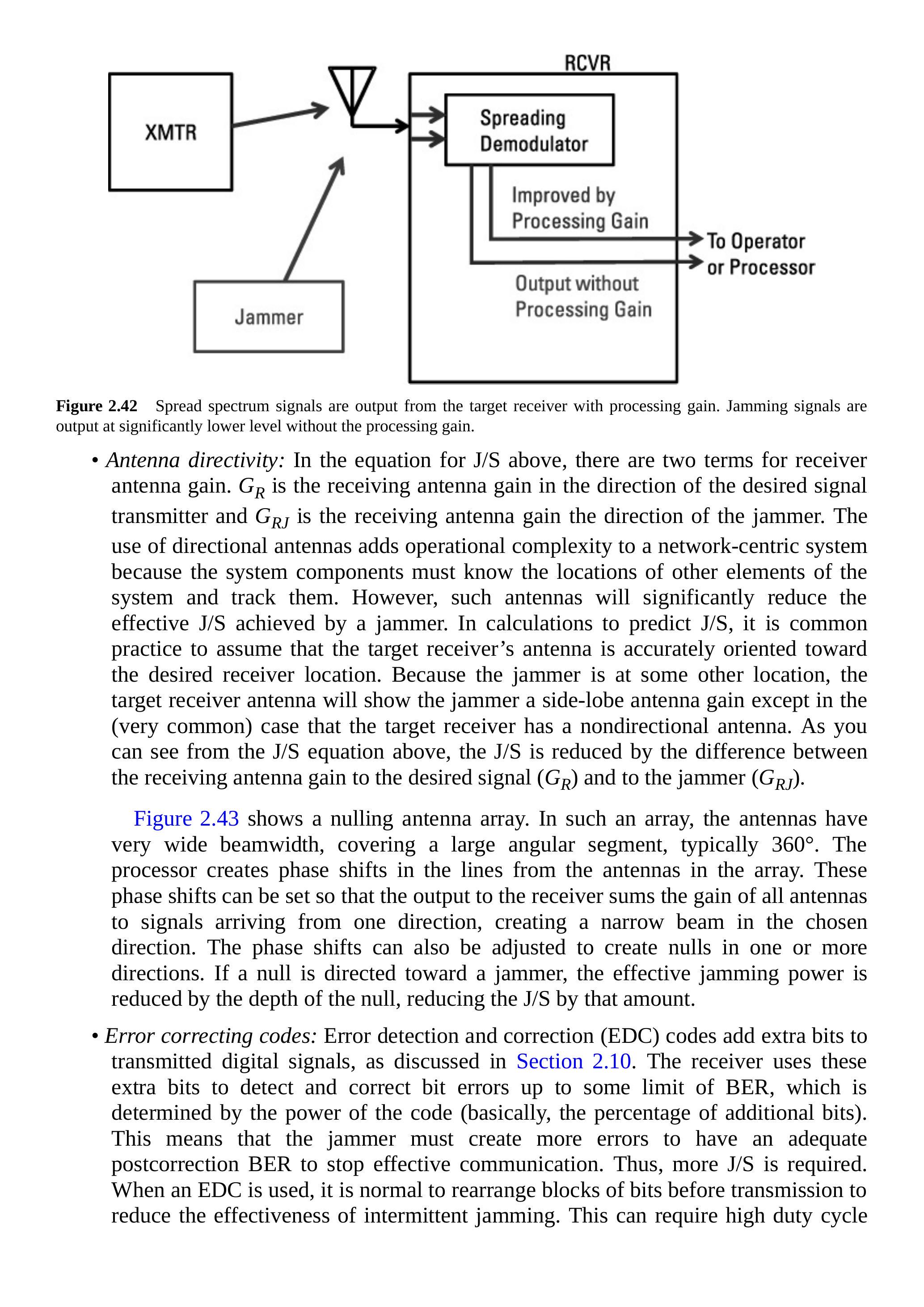 图2.43展示了一个零陷天线阵。此类阵列中的天线波束宽,通常覆盖\(360^\circ\)。处理器在各天线馈线中施加相位移,从而在选定方向形成窄波束。相位移也可调整为在一个或多个方向形成零陷。如果零陷指向干扰机,等效干扰功率会因零陷深度而降低,相应减少J/S。