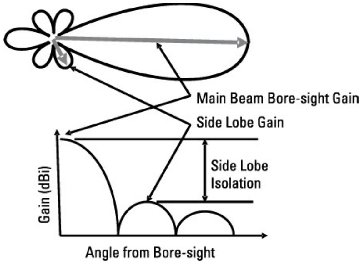 图中下方的曲线展示了横轴为视线方向偏角,纵轴为增益。在该曲线上定义了波束中心(boresight)增益和第一旁瓣的相对水平。波束中心和旁瓣增益通常用dBi(相对各向同性的分贝)表示,而相对旁瓣电平则用分贝表示。