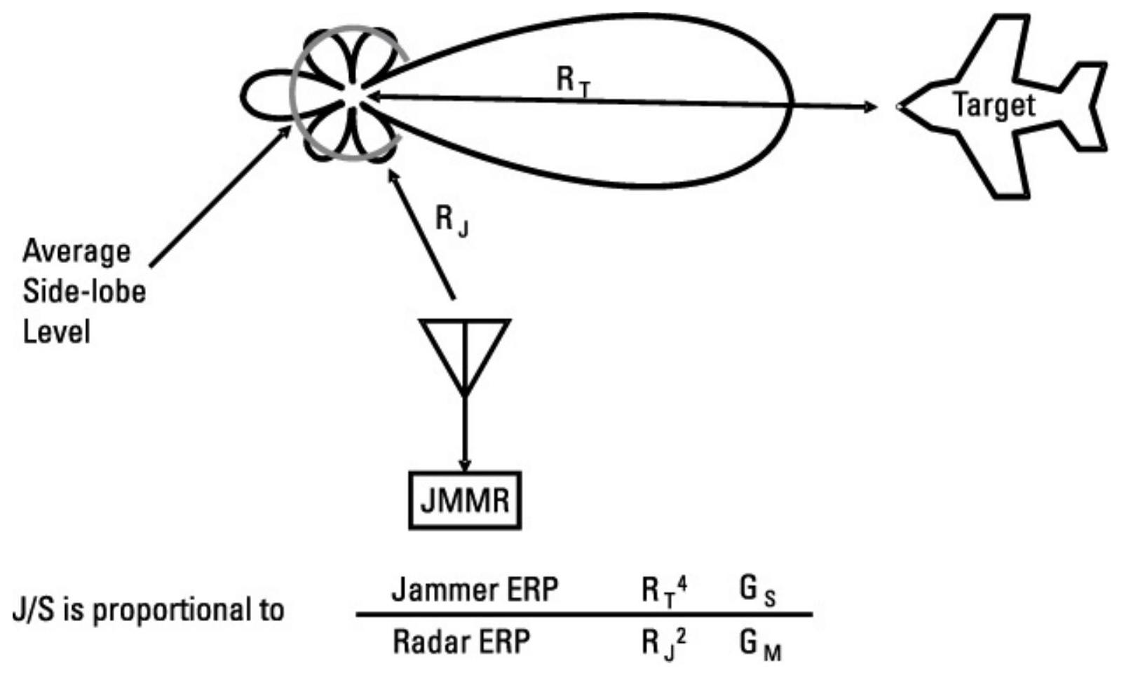 正如第3.3.3节所讨论的,远程压制干扰通常是向雷达的旁瓣发射,因为一个干扰机(例如EA-6B飞机吊舱)通常会同时干扰多个雷达。如图4.3所示,远程压制干扰信号比(J/S)是干扰机与雷达的相对ERP、目标距离(\(R_{T}\))的四次方与干扰机至雷达距离(\(R_{J}\))平方之比、以及雷达天线平均旁瓣增益(\(G_{S}\))与波束中心增益(\(G_{M}\))之比的函数。因此,在其他条件不变时,旁瓣增益降低10 dB会使得特定J/S水平的干扰距离减少3.16倍;20 dB旁瓣隔离会使远程干扰距离减少10倍。