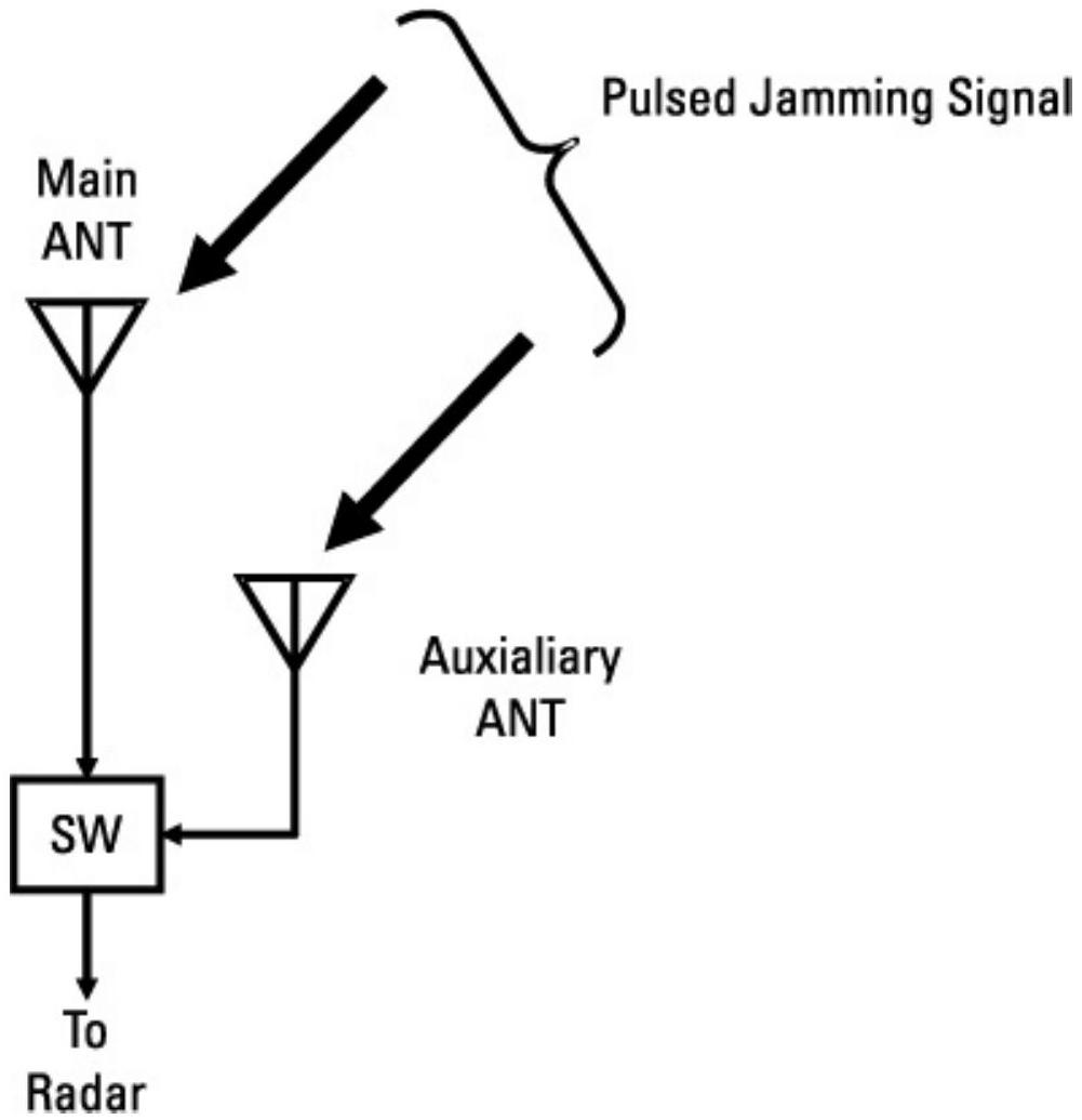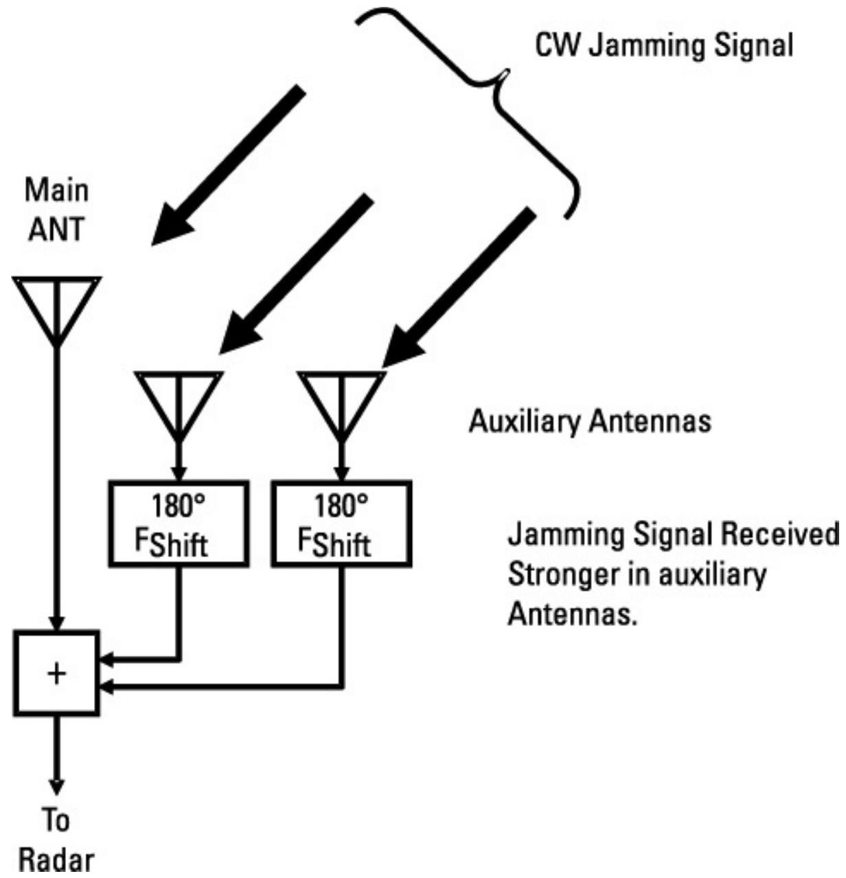 每个被抵消的干扰信号都需要一个单独的天线和移相电路。由于图4.5中有两个辅助天线,该雷达能够抵消两个CW旁瓣干扰机。