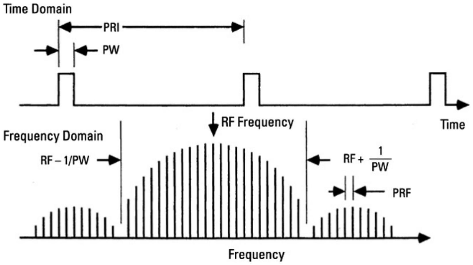 有趣的是,脉冲信号的傅里叶变换(即从频域观察脉冲信号)具有大量离散的谱线,如图4.6所示。图上部分显示了时域中的脉冲信号(示波器显示),图下部分显示了频域中的同一信号(频谱分析仪显示)。需要注意的是,频率响应的主瓣宽度为\(1/\mathrm{PW}\),其中PW是时域中的脉宽。同时注意到,谱线的间隔等于脉冲重复频率(PRF)。PRF=\(1/\)PRI,其中PRI是时域中的脉冲重复间隔。因此,将单个脉冲信号发射到由旁瓣抵消器保护的雷达旁瓣中,可以触发多个相干旁瓣抵消电路,从而使CSLC对噪声干扰无效。这也是有时需要在旁瓣噪声干扰中加入脉冲信号的原因。