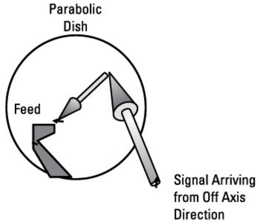 图4.10 抛物面反射器边缘的正向几何导致离轴信号在反射进入天线馈源时极化发生\(90^{\circ}\)变化。