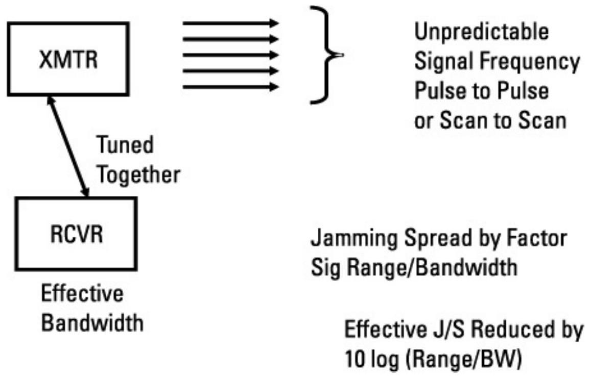 如果雷达采用伪随机脉冲间的频率跳变信号,就无法预测下一脉冲的频率。因此,干扰机必须要么在雷达的每一个频率上干扰,要么将干扰功率分散到整个跳频范围。这将使\(\mathrm{J}/\mathrm{S}\)降低数个分贝(见第4.2.19节)。
