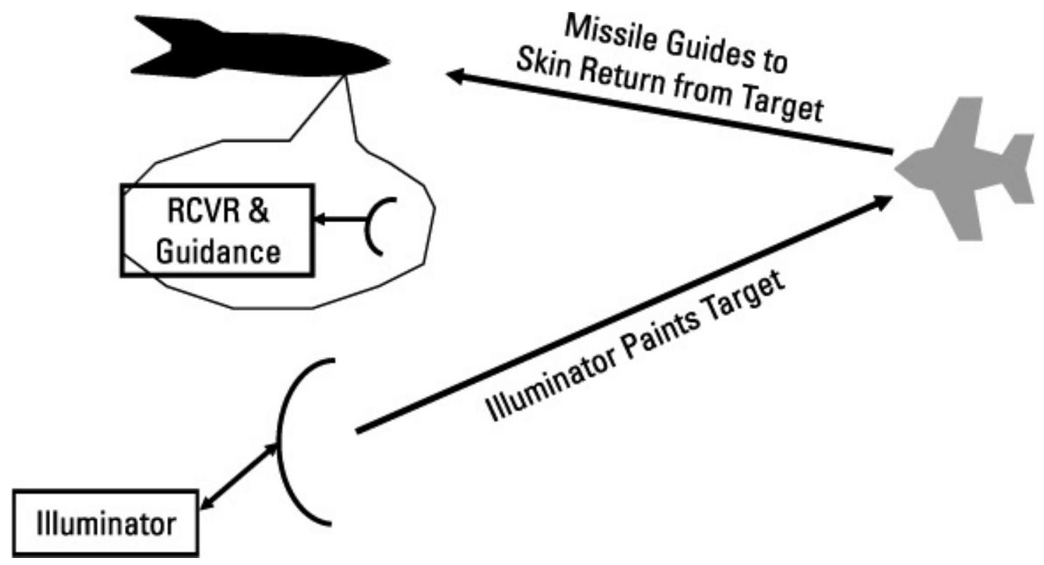 图4.44 许多现代导弹在捕获目标后使用惯性制导,中段转换为指令制导,末段则采用半主动、被动制导或TVM制导。