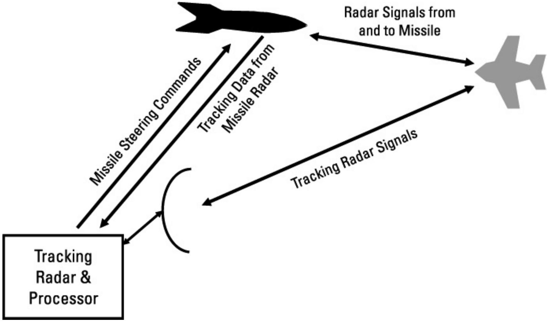图4.43 当采用导弹中继跟踪时,导弹上的次级雷达对目标进行跟踪,并将信息传回主雷达以提高整体精度。