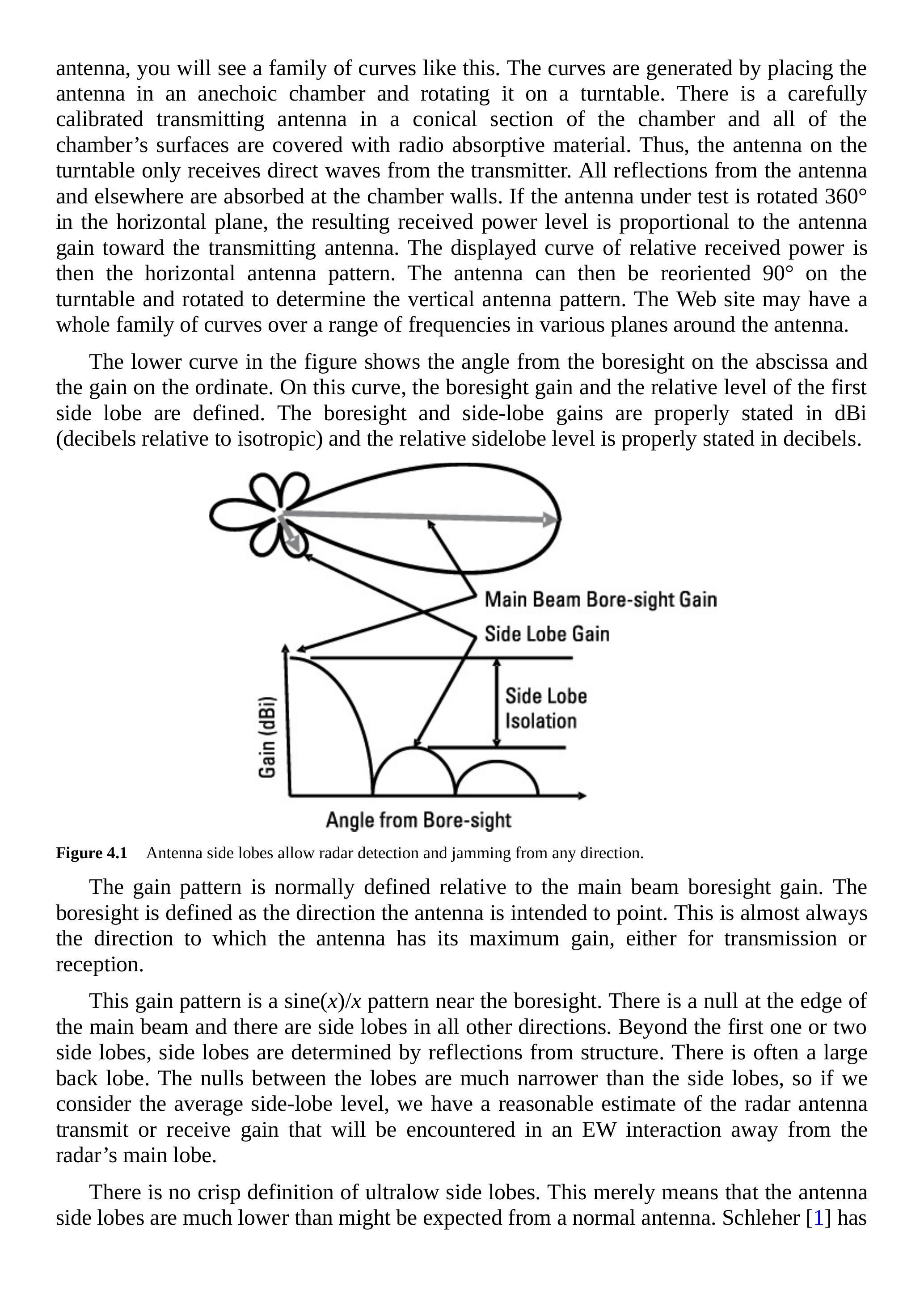 要探测尚未锁定目标的雷达存在,接收机(例如雷达告警接收机)必须具有足够的灵敏度(包括天线增益),以接收到雷达旁瓣信号。在这种情况下,接收机灵敏度要求接收到足够的信号功率来确定信号的到达方向,并支持信号参数分析,以判断雷达类型和工作模式。如图4.2所示,与旁瓣截获问题相关的雷达ERP是发射机输出(有时称为电子管功率)与平均旁瓣增益的乘积。雷达信号强度随着距离平方衰减。因此,旁瓣增益减少10 dB(即旁瓣方向ERP降低10 dB)会使得在固定接收机灵敏度水平下的探测距离减少\(\sqrt{10}\)倍(即3.16);20 dB旁瓣隔离会使探测距离减少10倍。需要注意,第5章将对无线电传播模型进行完整讨论。