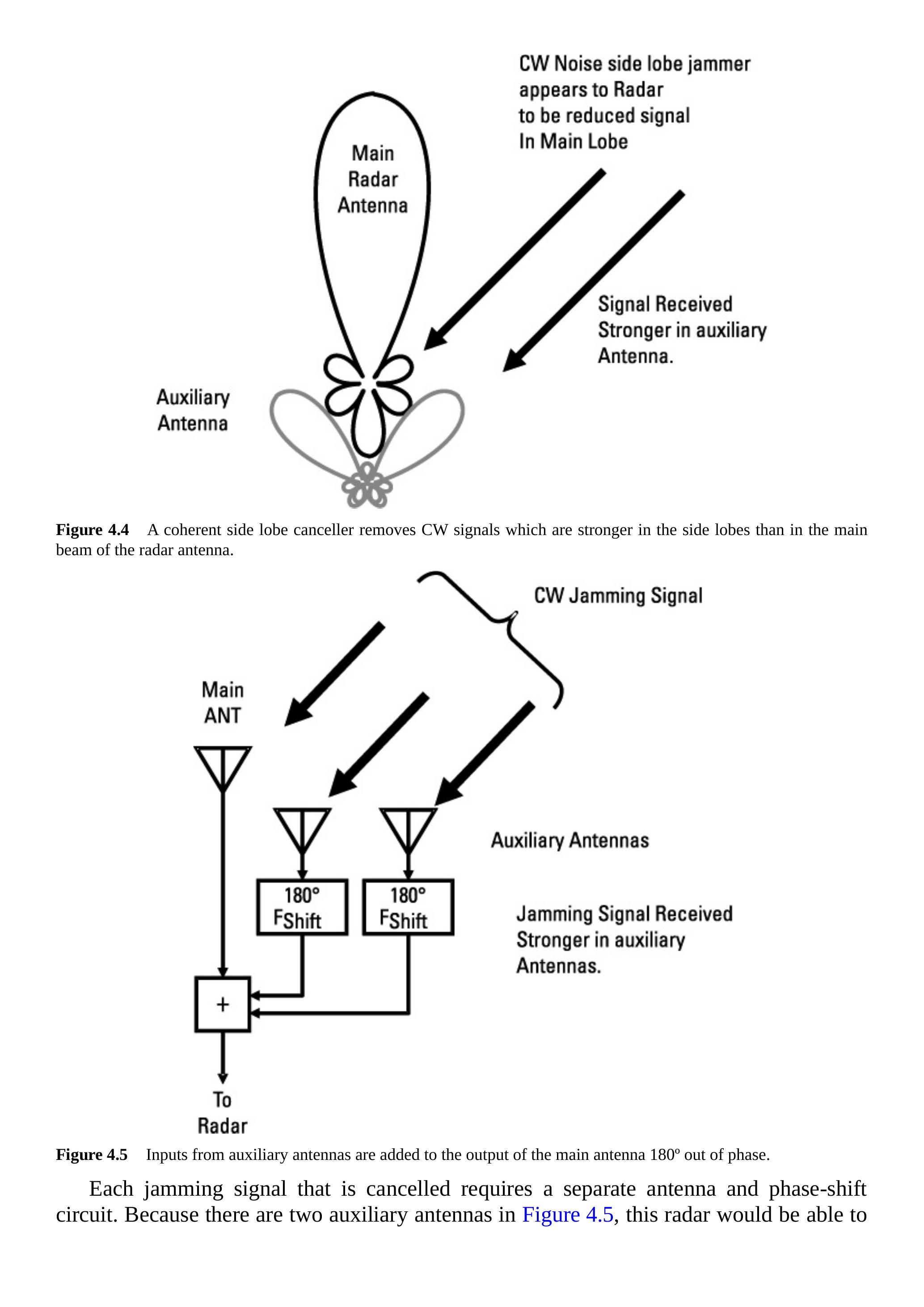 每个被抵消的干扰信号都需要一个单独的天线和移相电路。由于图4.5中有两个辅助天线,该雷达能够抵消两个CW旁瓣干扰机。