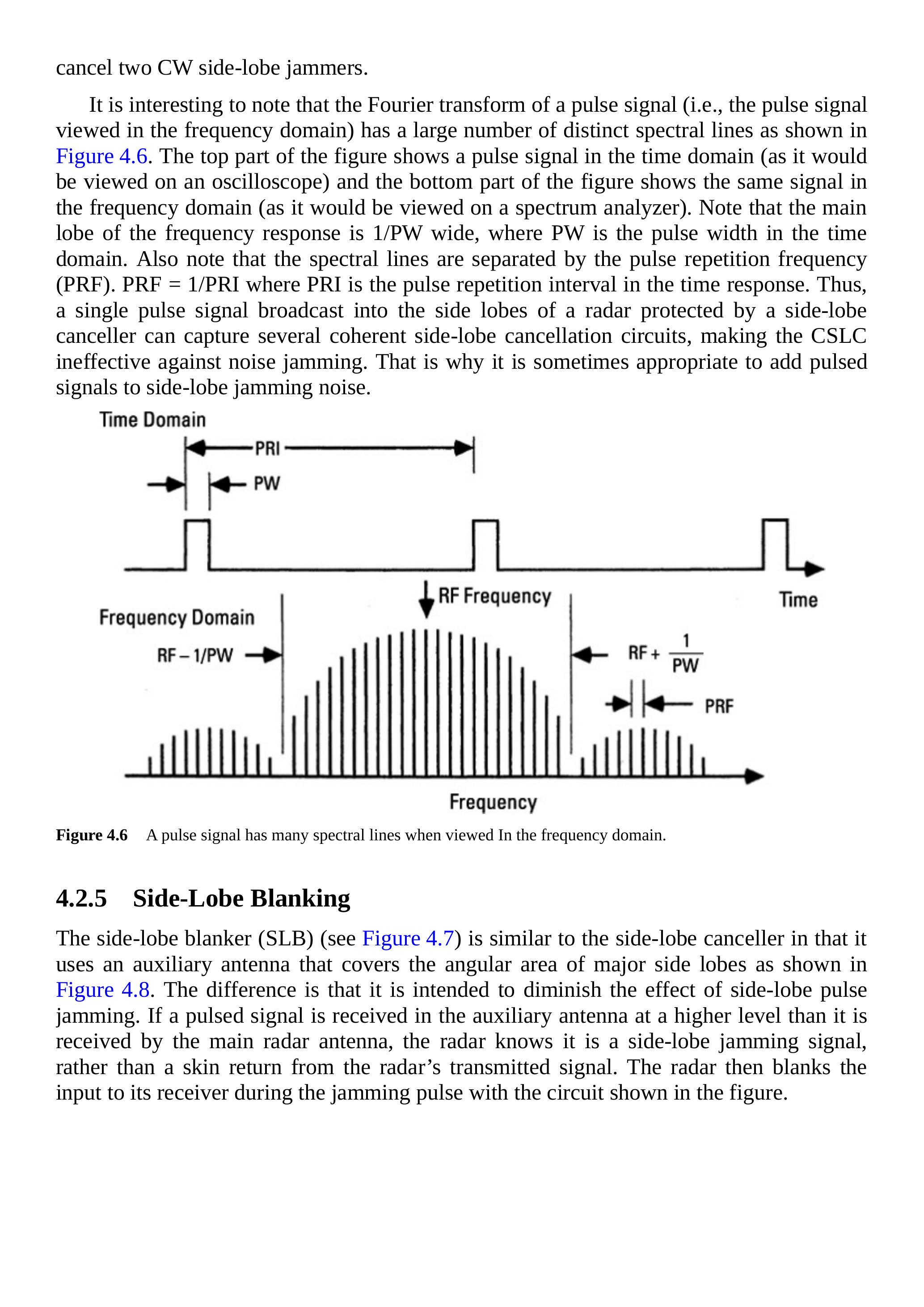 有趣的是,脉冲信号的傅里叶变换(即从频域观察脉冲信号)具有大量离散的谱线,如图4.6所示。图上部分显示了时域中的脉冲信号(示波器显示),图下部分显示了频域中的同一信号(频谱分析仪显示)。需要注意的是,频率响应的主瓣宽度为\(1/\mathrm{PW}\),其中PW是时域中的脉宽。同时注意到,谱线的间隔等于脉冲重复频率(PRF)。PRF=\(1/\)PRI,其中PRI是时域中的脉冲重复间隔。因此,将单个脉冲信号发射到由旁瓣抵消器保护的雷达旁瓣中,可以触发多个相干旁瓣抵消电路,从而使CSLC对噪声干扰无效。这也是有时需要在旁瓣噪声干扰中加入脉冲信号的原因。