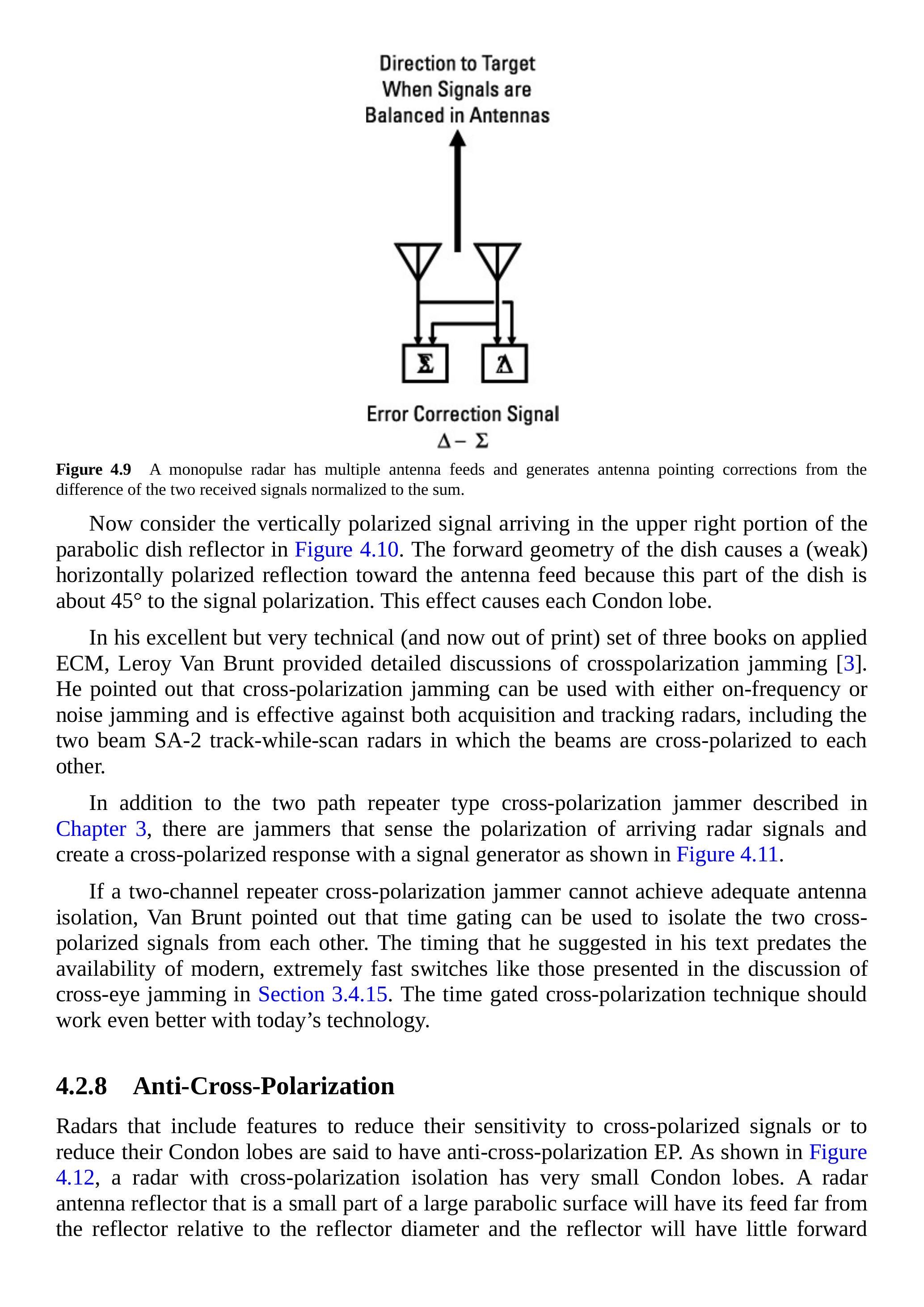 单脉冲雷达从每一个回波脉冲中获取到达方向信息。由于这一特性使某些欺骗干扰无效,因此它可以被视为一种EP技术。需要注意的是,单脉冲雷达的运行已在第3章中讨论。