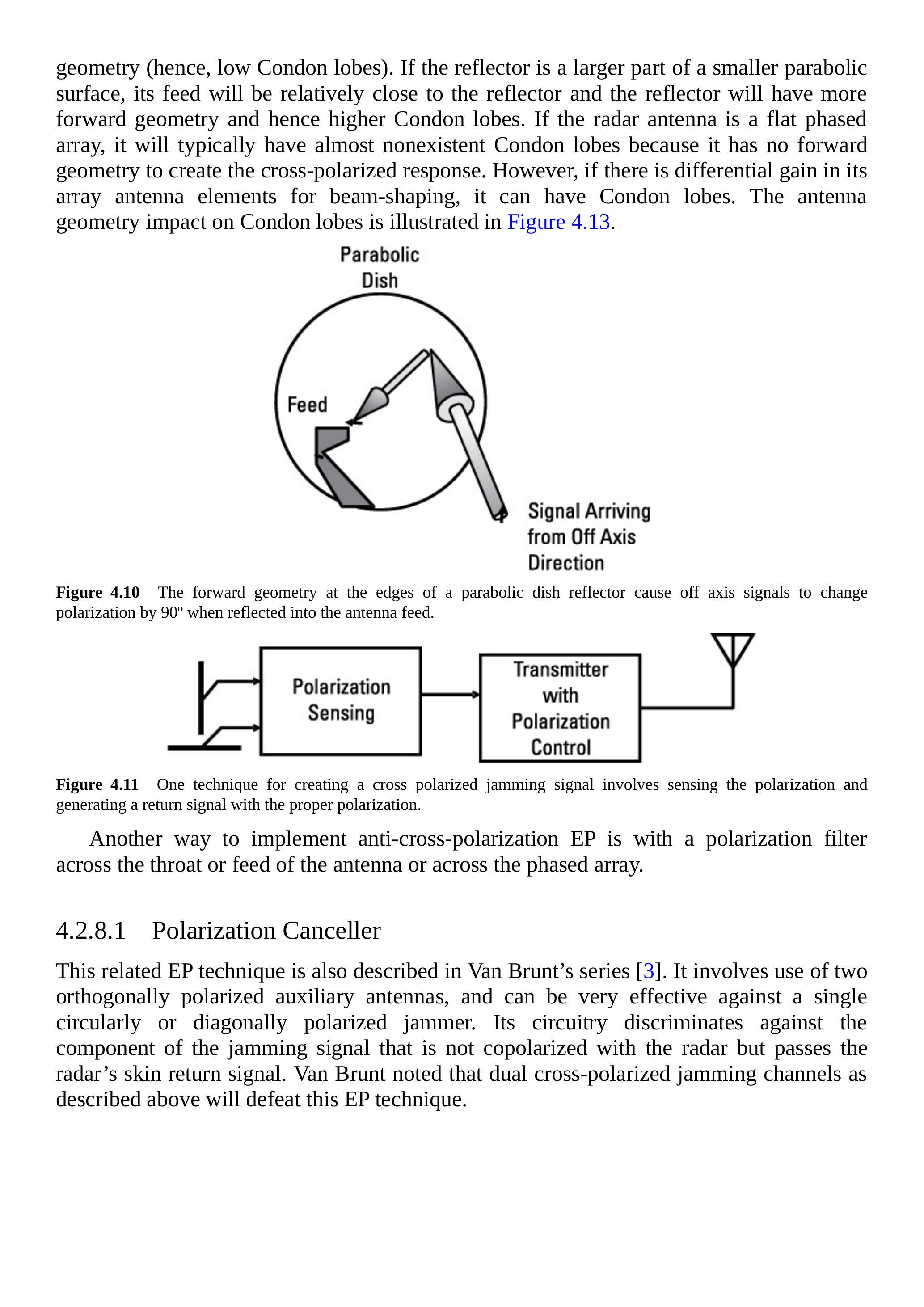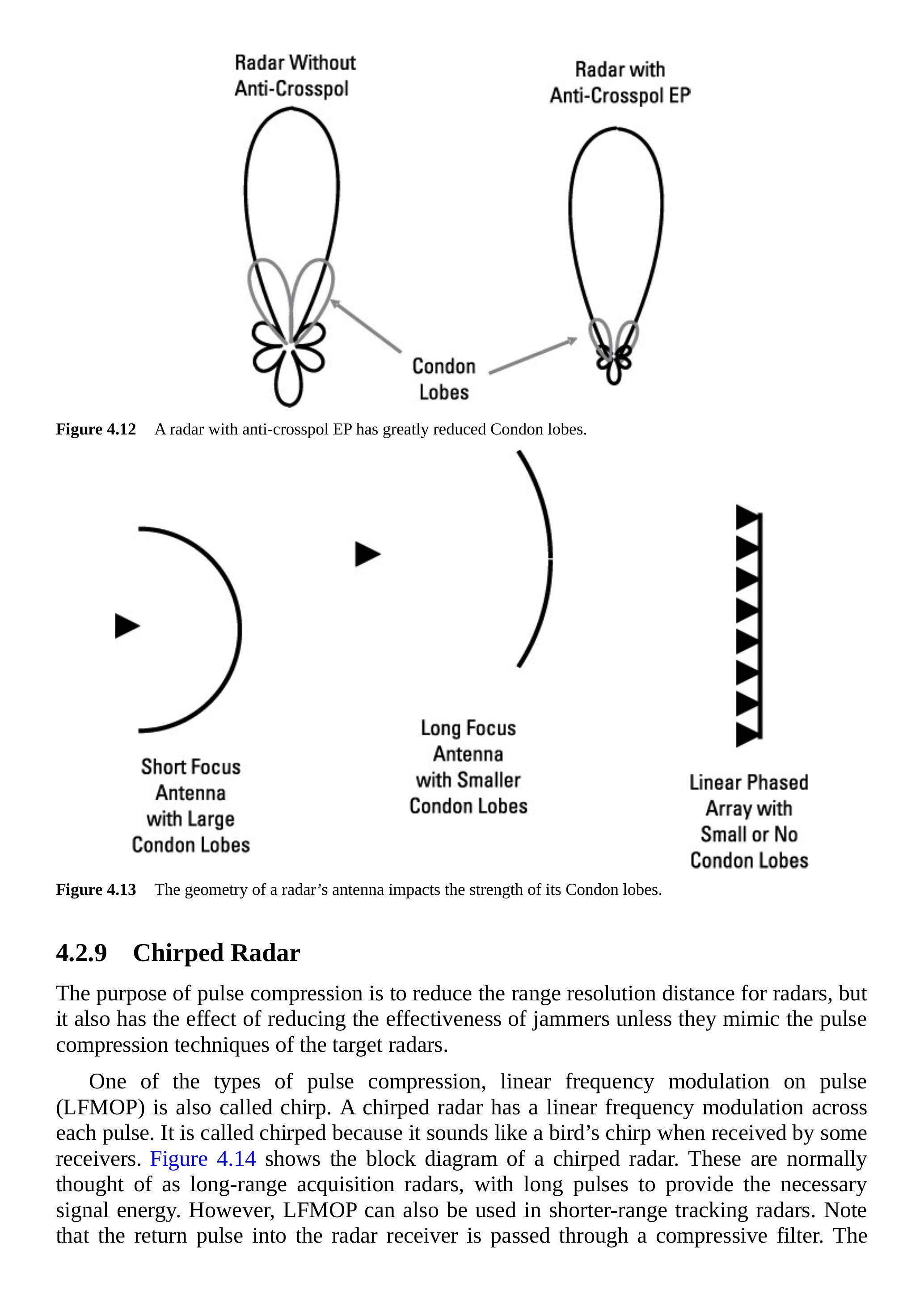 具有降低对交叉极化信号敏感性或降低Condon瓣特性的功能的雷达被称为具备抗交叉极化EP。如图4.12所示,具备交叉极化隔离的雷达其Condon瓣非常小。一个雷达天线反射器若只是大型抛物面的一小部分,则其馈源相对于反射器直径距离较远,反射器正向几何较小(因此Condon瓣较低)。如果反射器是小型抛物面的大部分,则其馈源相对于反射器较近,反射器正向几何较大,从而Condon瓣较高。如果雷达天线是平面相控阵,由于没有正向几何可产生交叉极化响应,通常几乎不存在Condon瓣。然而,如果其阵元在波束形成上存在差分增益,则仍可能产生Condon瓣。天线几何对Condon瓣的影响如图4.13所示。