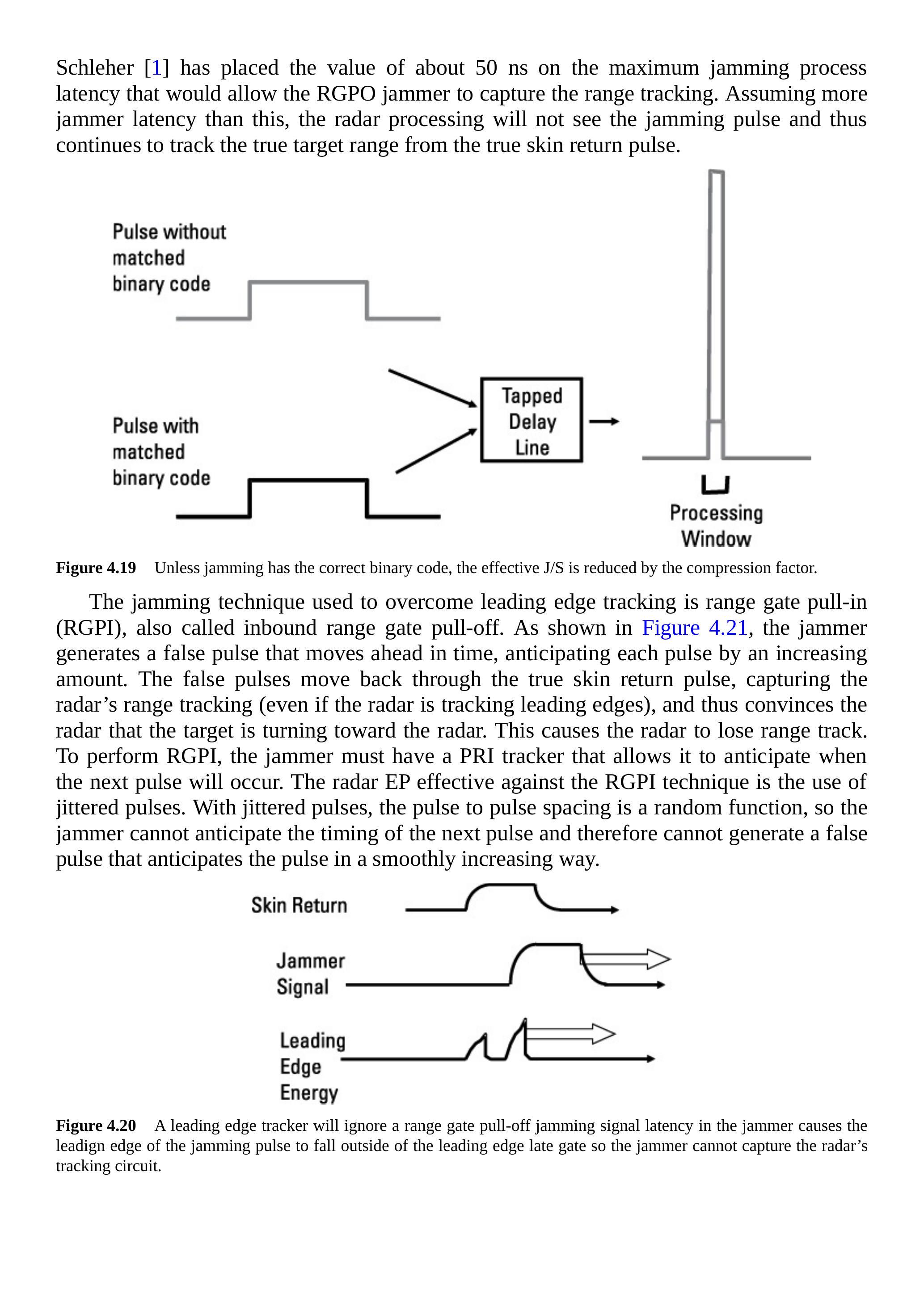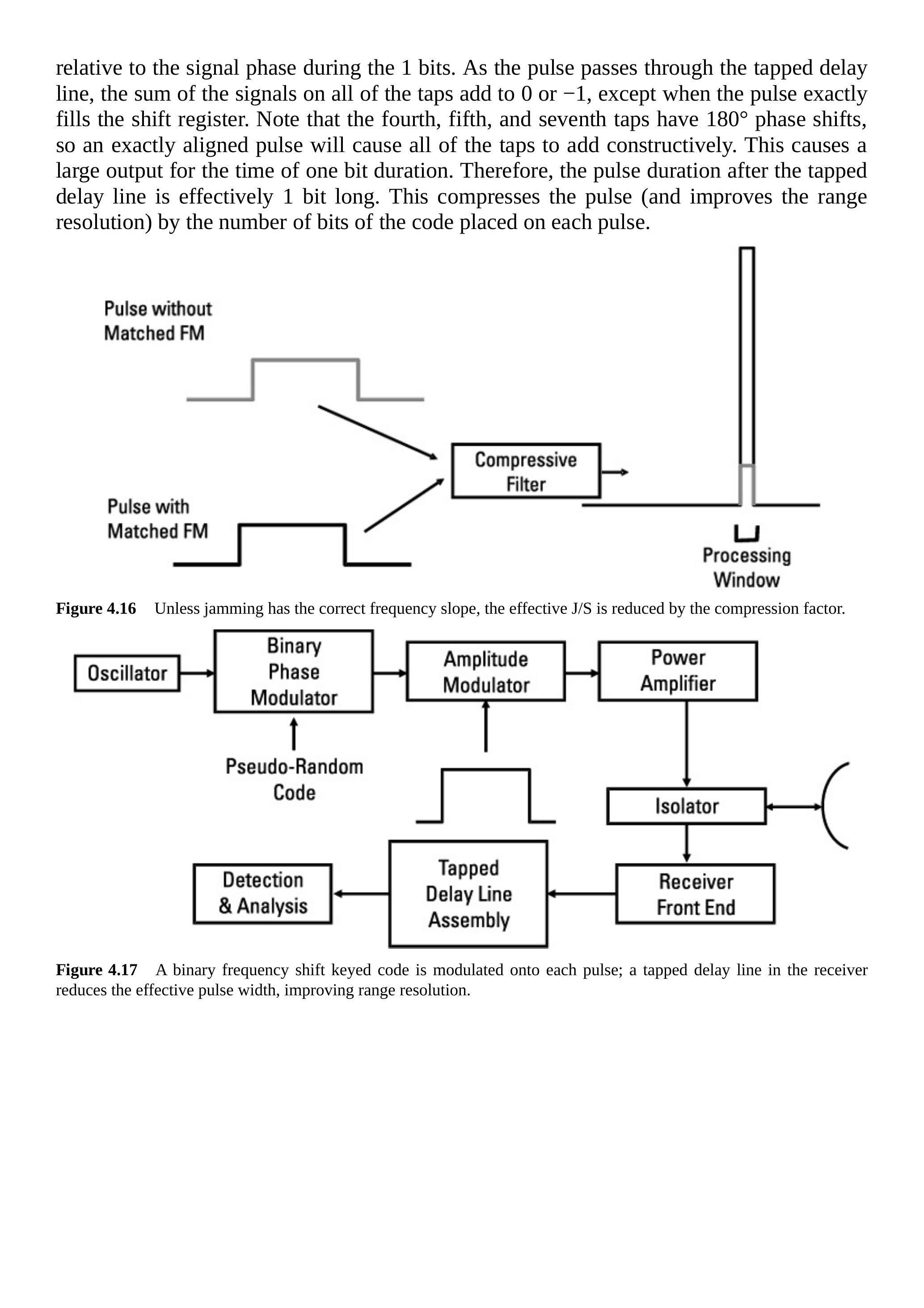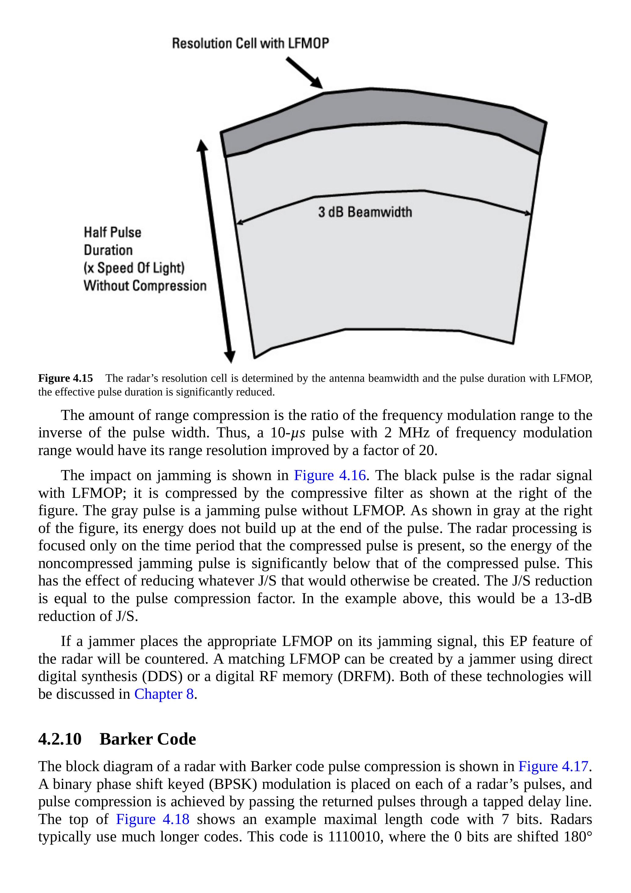 若干扰信号未包含威胁雷达的压缩波形(线性调频或Barker码),\(\mathrm{J}/\mathrm{S}\)将按压缩因子降低,可达30 dB(见第4.2.10节)。