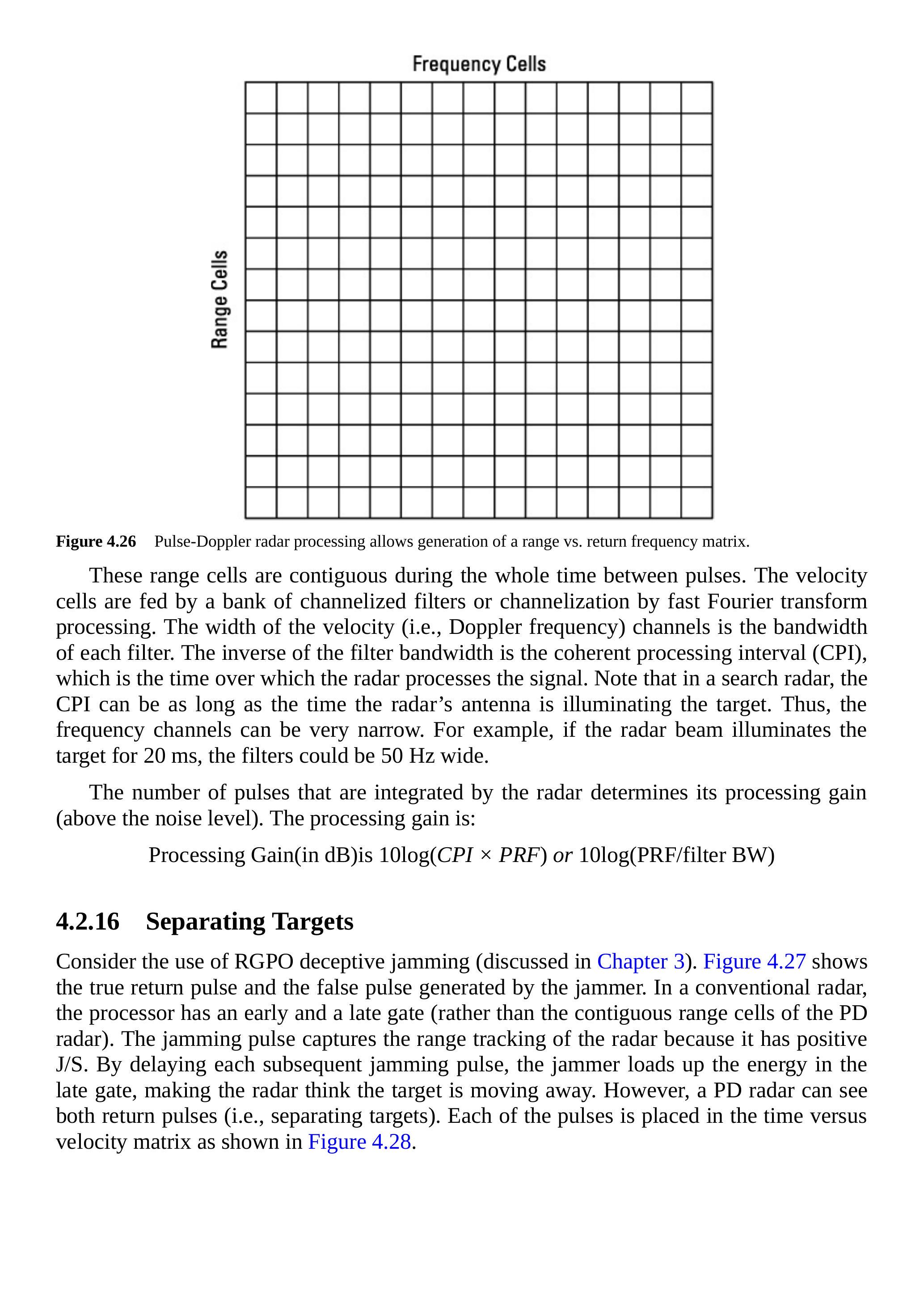 雷达处理还会降低噪声干扰在多个通道内实现的\(\mathrm{J}/\mathrm{S}\),并能辨别由箔条引起的回波。