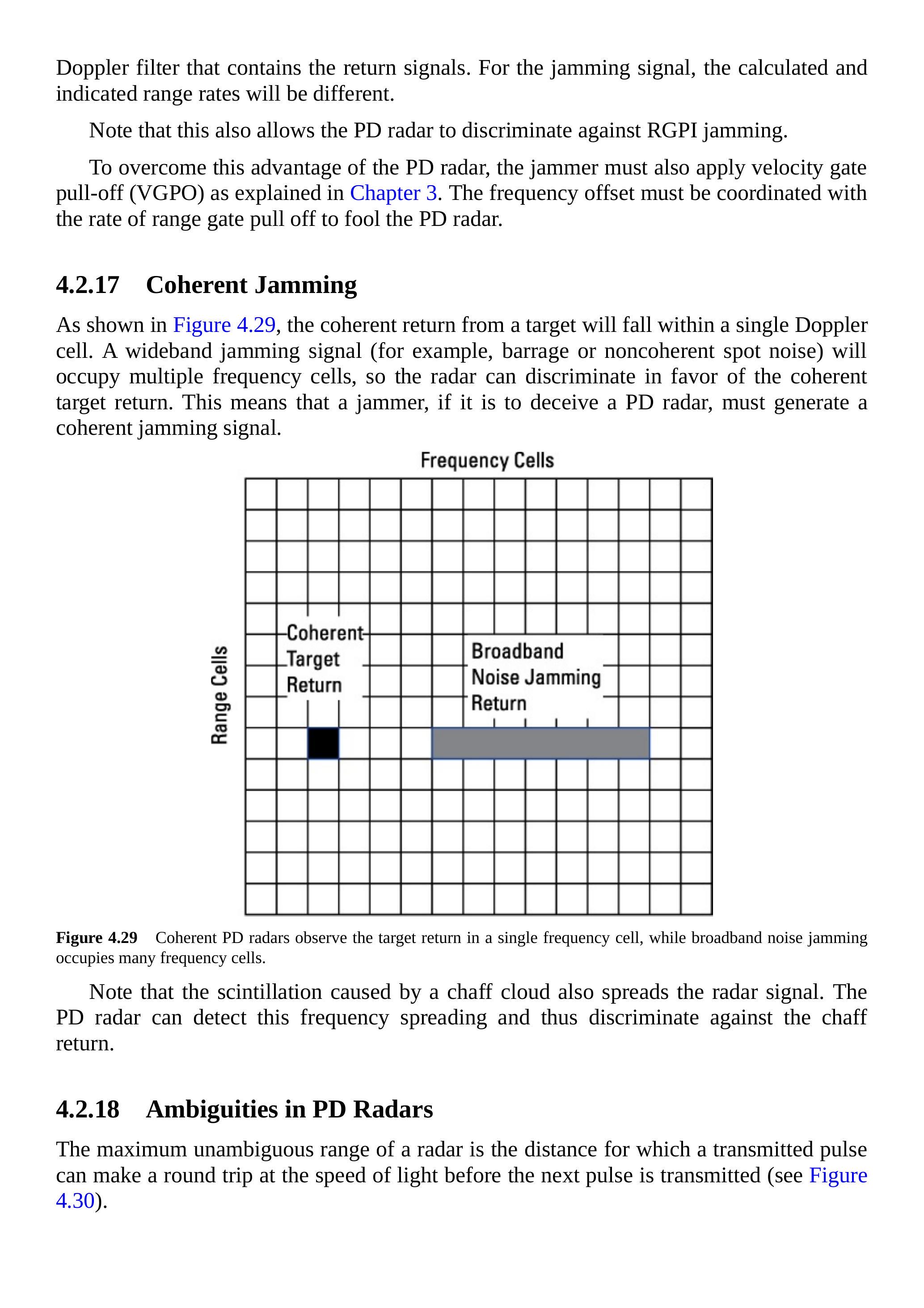 如果雷达采用伪随机脉冲间的频率跳变信号,就无法预测下一脉冲的频率。因此,干扰机必须要么在雷达的每一个频率上干扰,要么将干扰功率分散到整个跳频范围。这将使\(\mathrm{J}/\mathrm{S}\)降低数个分贝(见第4.2.19节)。
