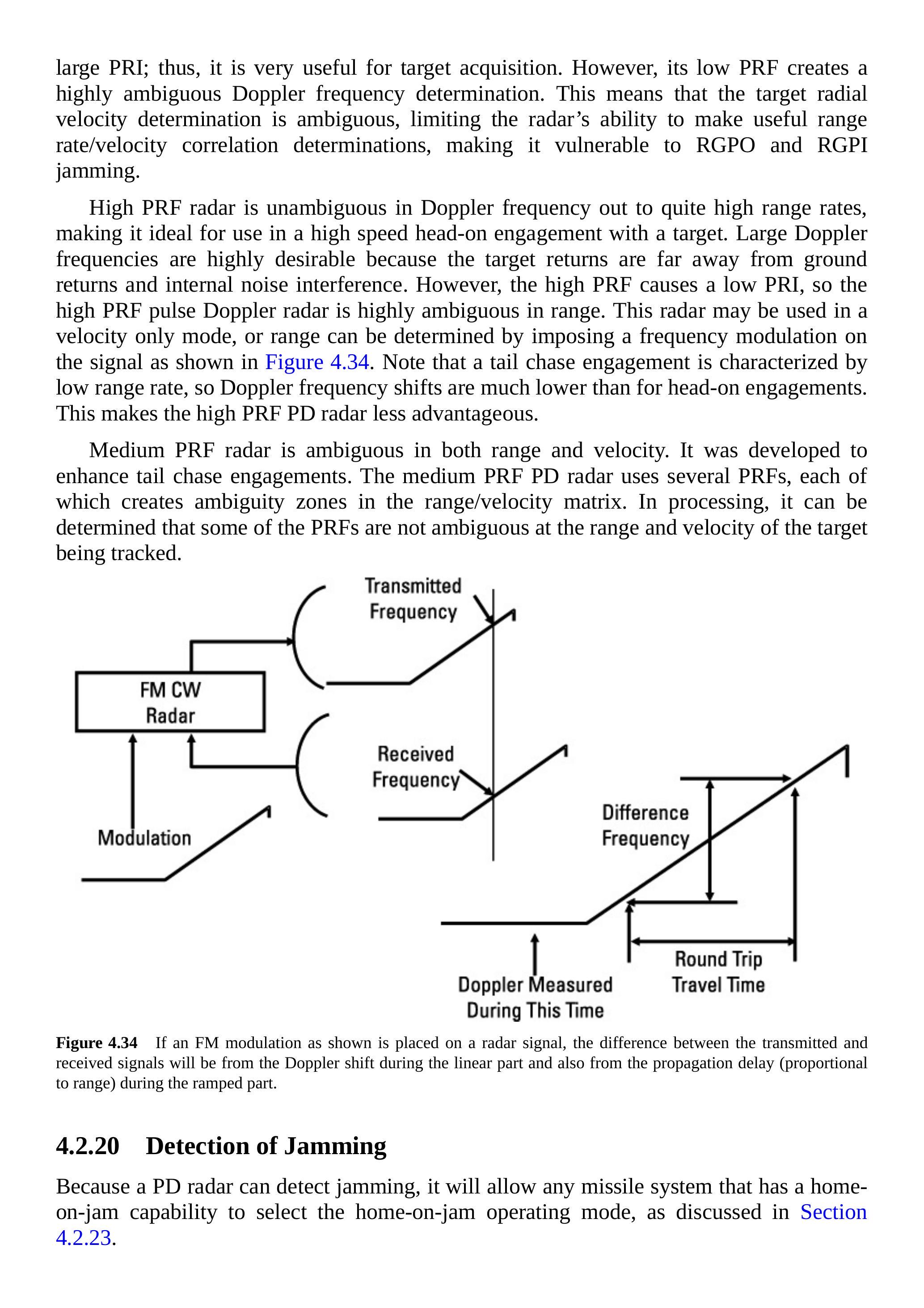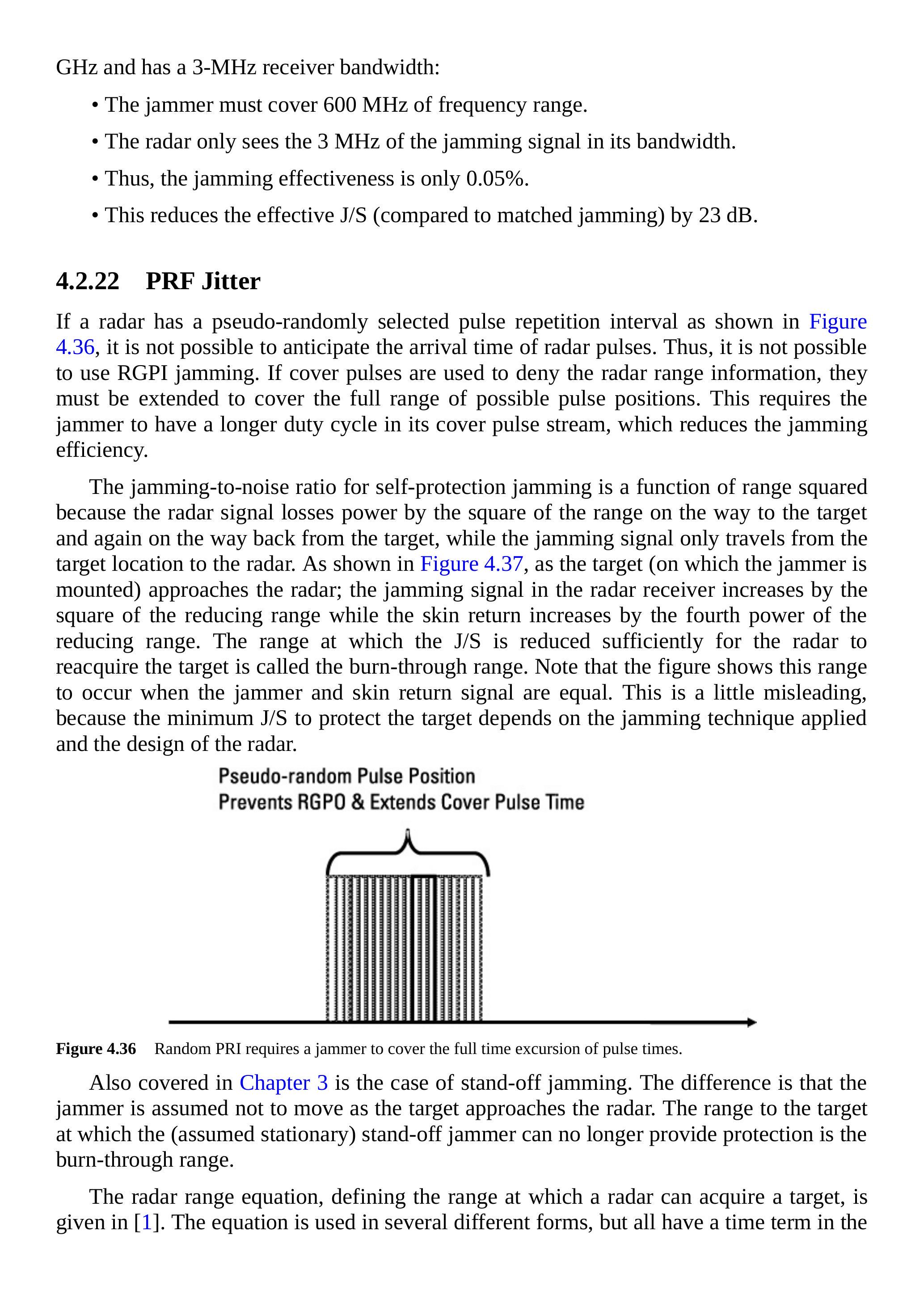 如果威胁雷达采用伪随机脉冲重复间隔,即抖动PRF,就无法预测下一个脉冲的时间。这使RGPI干扰技术不可行。同时,覆盖脉冲干扰(需要预测脉冲时序)也无法高效生成(见第4.2.20节)。