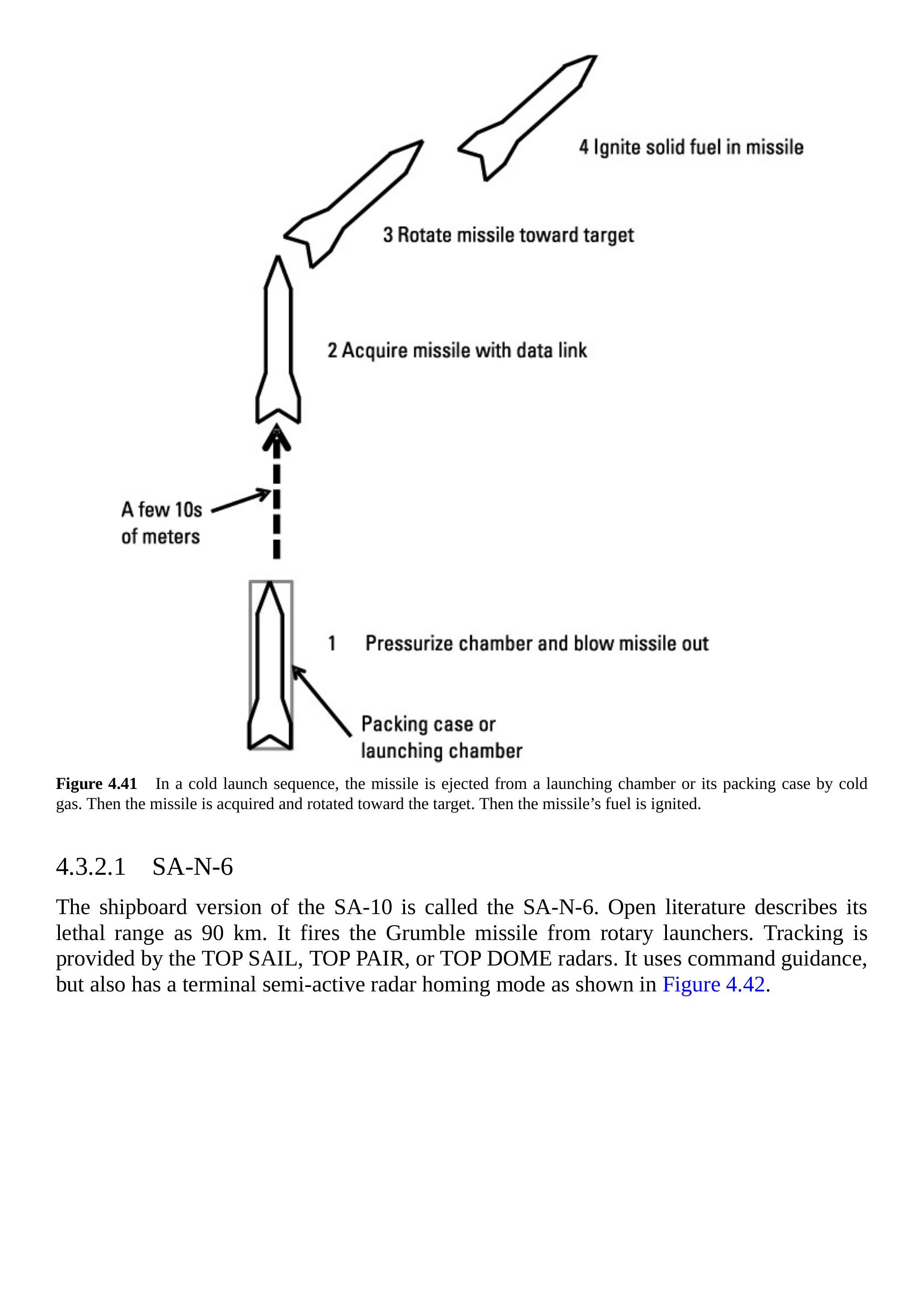 SA-10的舰载版本称为SA-N-6。开源资料显示其杀伤范围为90 km,使用Grumble导弹由旋转式发射器发射。其跟踪由TOP SAIL、TOP PAIR或TOP DOME雷达提供。该系统采用指令制导,并在末段具备半主动雷达制导模式(见图4.42)。