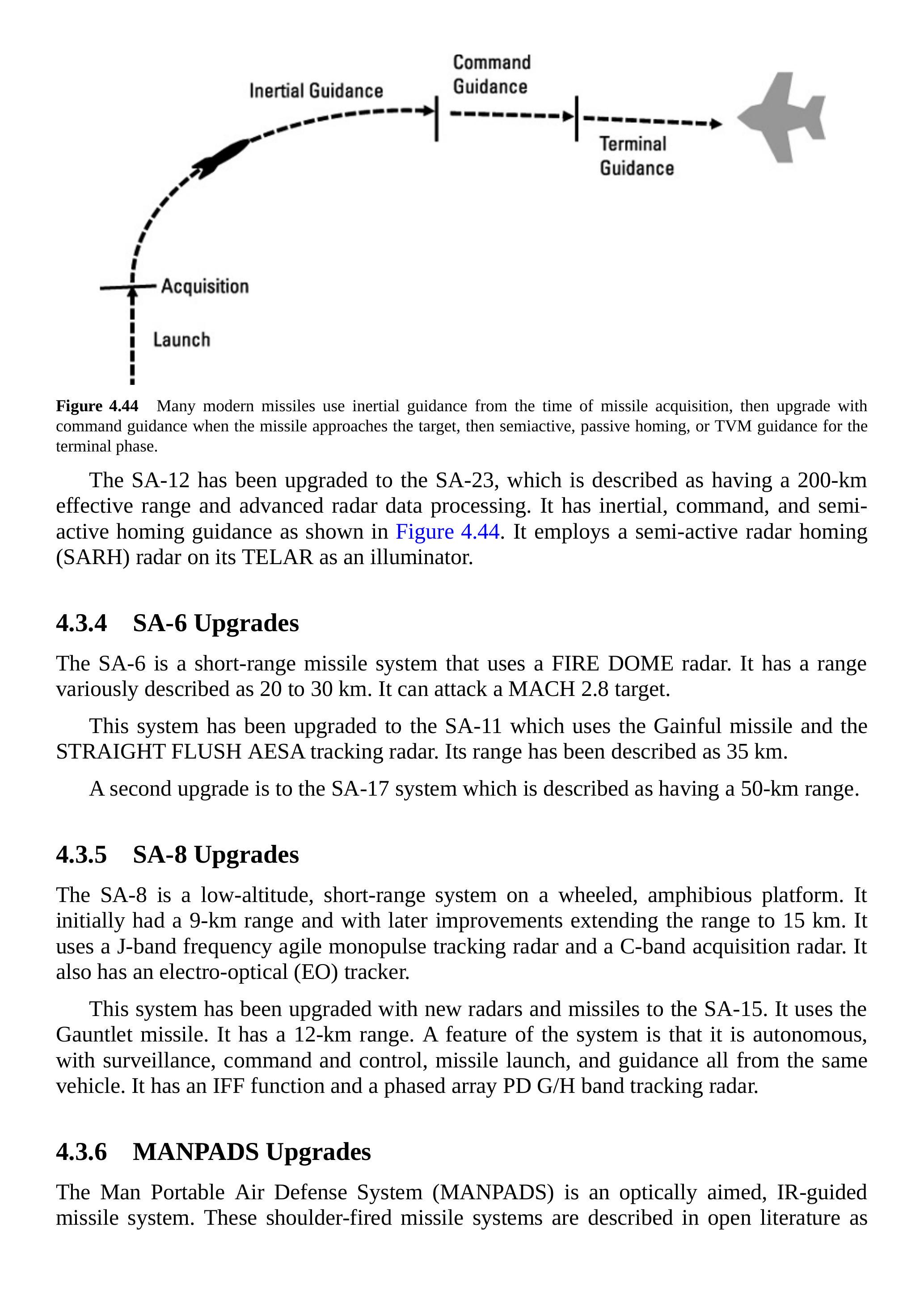 SA-12升级为SA-23,据称射程达200 km,并具备先进的雷达数据处理能力。其制导方式包括惯性制导、中段指令制导及末段半主动雷达制导,如图4.44所示。该系统在TELAR上配备半主动雷达导引器作为照射机。