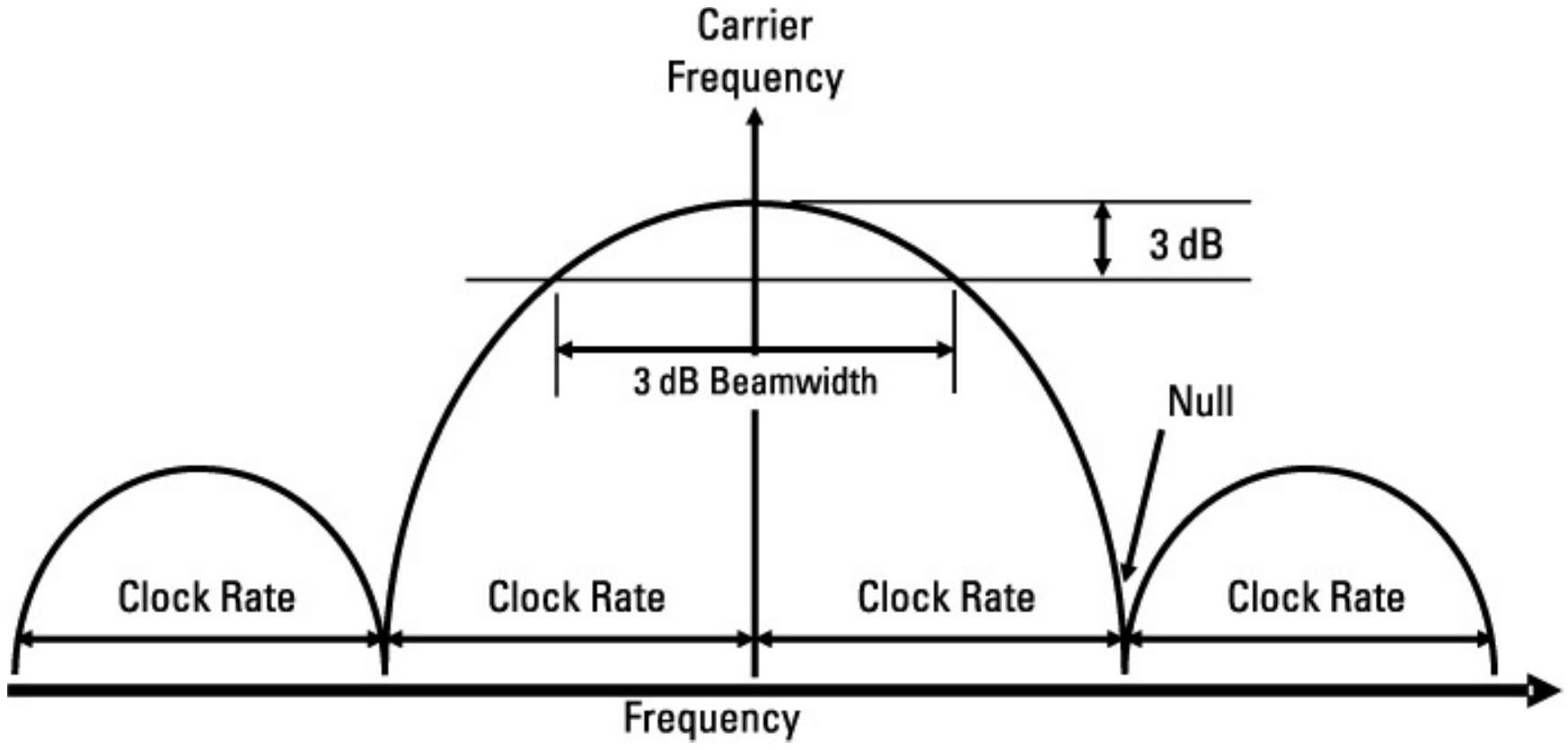 图5.5 数字信号频谱包括一个主瓣和若干边瓣,具有清晰的零点,这些零点以码钟频率的倍数间隔于载波频率两侧。