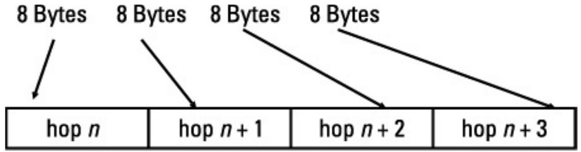 在使用分组码保护跳频链路时,常见的做法是在单次跳频过程中传输一个完整的字节块(例如,对于31,15码来说是31个字节)。请注意,被占用的跳频(即在干扰信号频率上的跳频)会导致所有接收比特出错。为克服这一问题,传输的字节会进行交织,这样在一个频率上传输的字节不会超过31个中的8个(在本例中)。图5.10展示了一种线性交织方案,其中第2组8个字节延迟到下一次跳频中传输,再下一组延迟到之后的跳频,依此类推。这样,在一次被占用的跳频过程中不会丢失超过8个连续字节。需要注意的是,伪随机交织在更长的字节序列中是常见的。任何交织方式都会导致一定的时延增加。