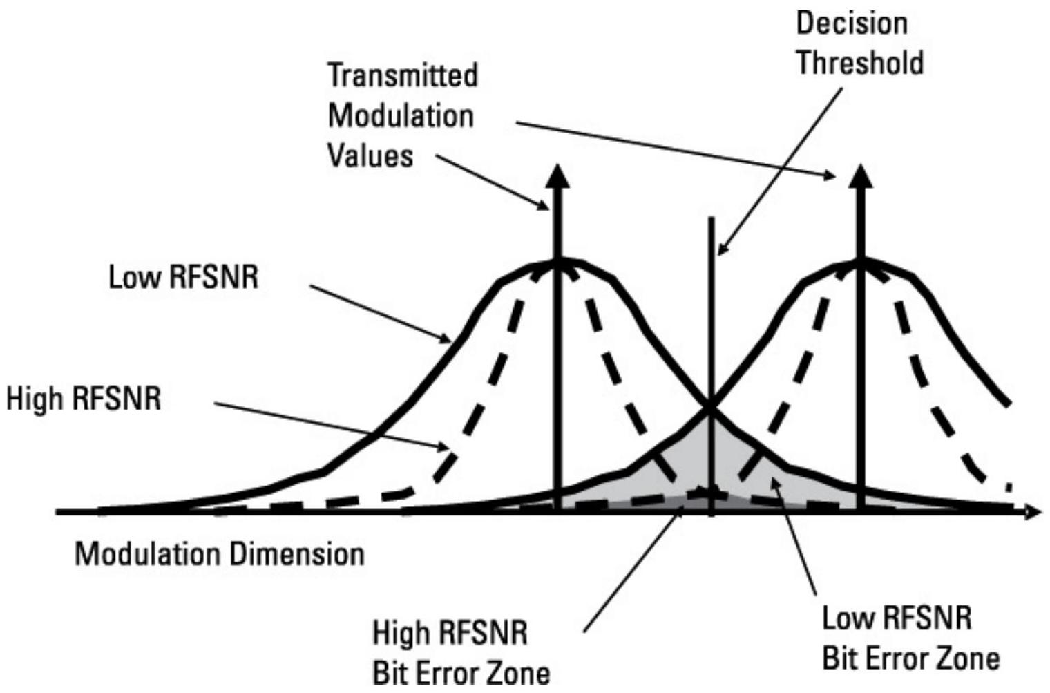 图5.14展示了接收机在接收到带噪声的信号时的判决过程。横轴为调制维度,纵轴为接收信号(含噪声)在各个调制值处出现的概率。FSK调制时调制维度是频率,PAM调制时是幅度,PSK调制时是相位。若噪声为高斯分布,则接收到的0的调制值会呈现以0值为中心的高斯曲线分布;1的调制值则以1值为中心呈高斯分布。有一个阈值决定接收到的是0还是1:若信号位于阈值左侧,输出0;若在右侧,输出1。两条高斯曲线下的阴影区域表示错误接收的比特。前检测SNR越大,高斯曲线越窄。比特错误率是错误比特数与总接收比特数的比值,与前检测SNR成反比。因为SNR越大,高斯曲线越收紧在无噪声的0和1值附近,从而错误面积越小。