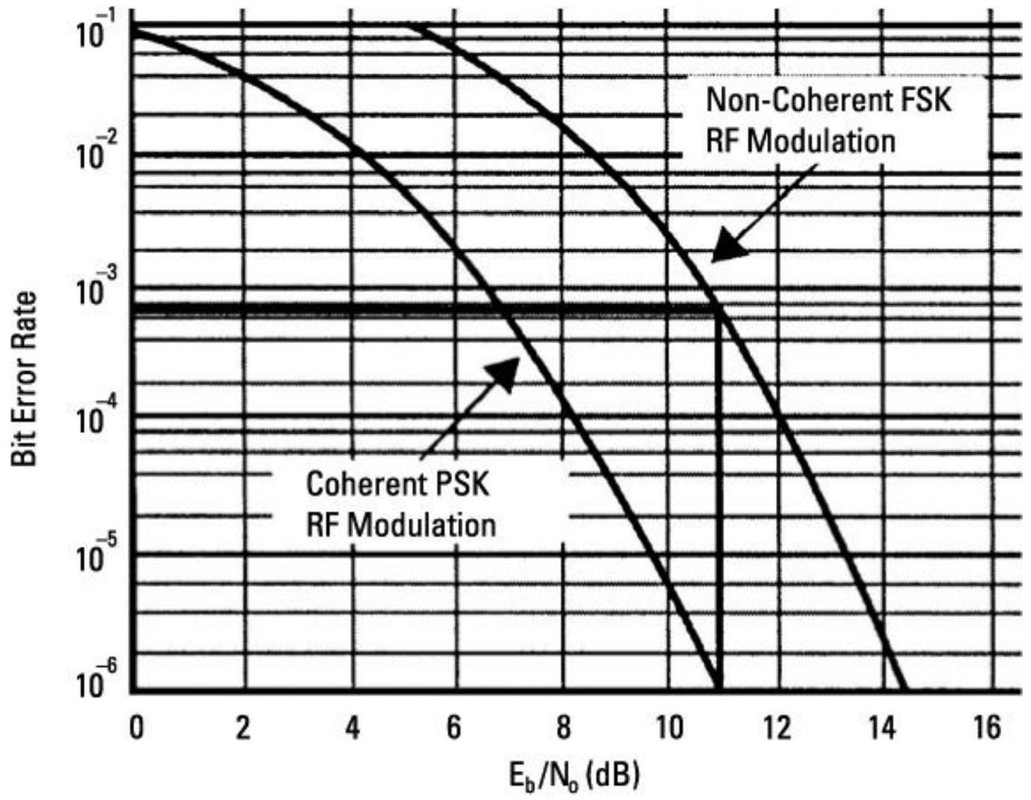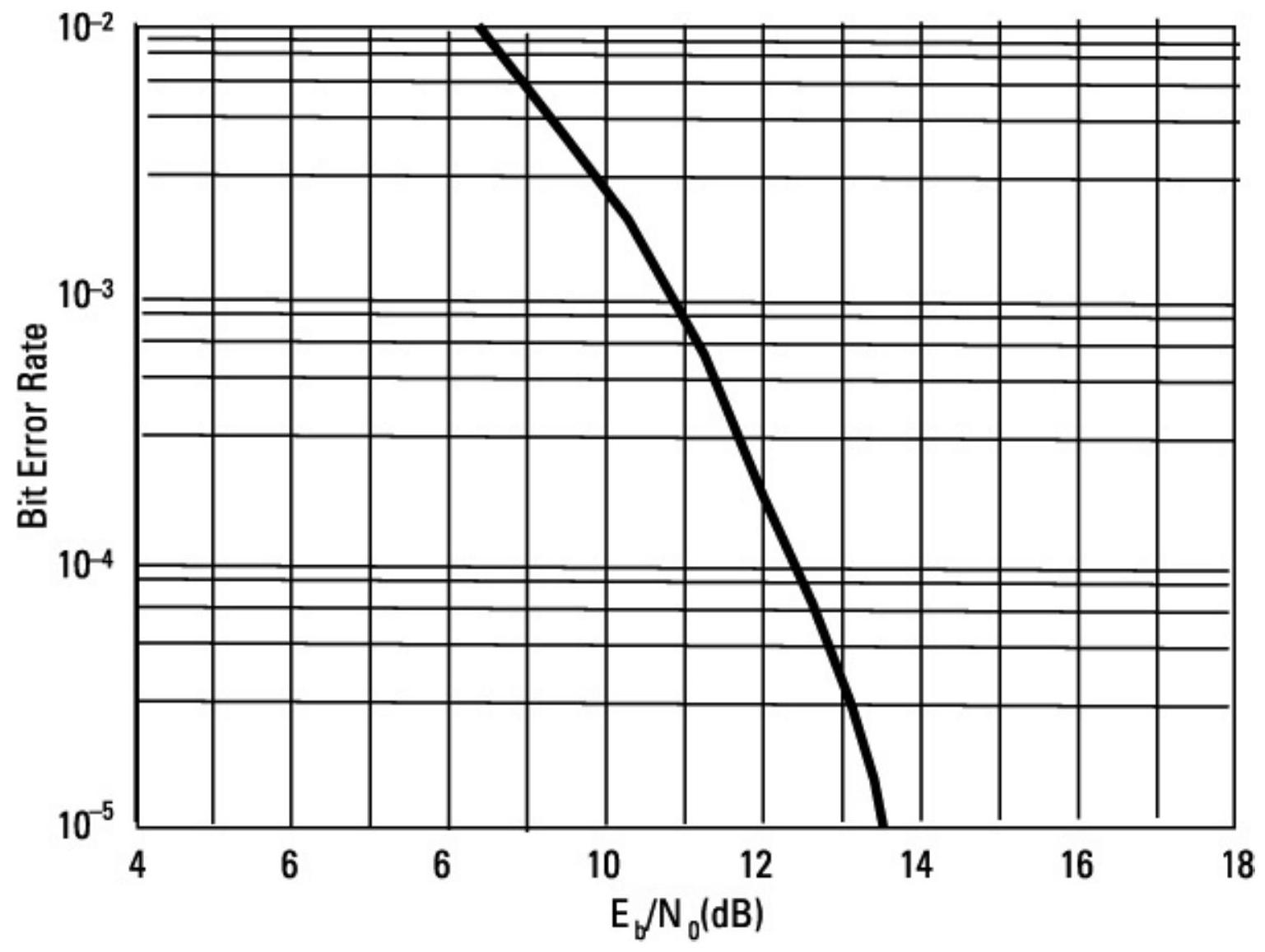 图5.15展示了比特错误率与\(E_{b}/N_{0}\)的关系。\(E_{b}/N_{0}\)是前检测SNR经比特率(比特/秒)与带宽(Hz)比值调整后的结果。不同调制方式曲线不同。波形越相干,曲线越左移。对于某种调制,当\(E_{b}/N_{0}=11\ \mathrm{dB}\)时,比特错误率为\(10^{-3}\)(即每千个比特中有1个错误)。