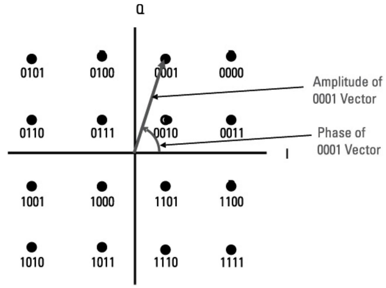 图5.18 I&Q调制具有16种幅度和相位条件,每种条件定义4比特信息。