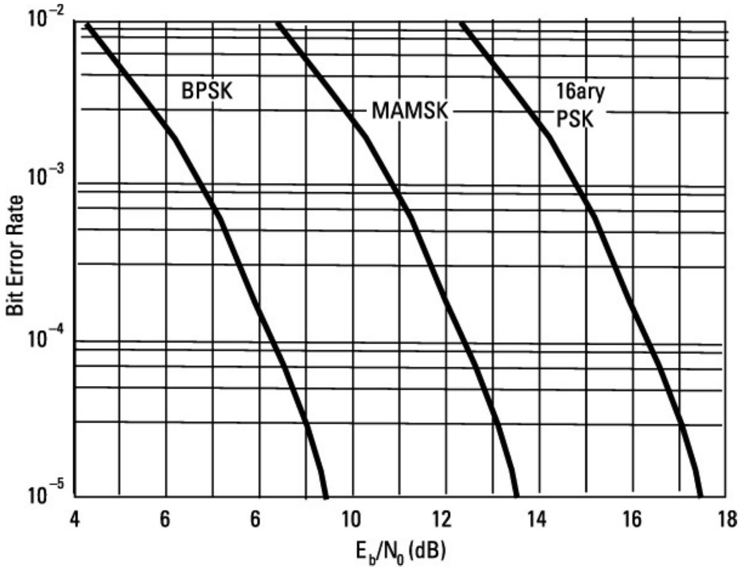 图5.19直接比较了三种调制的比特错误率与\(E_{b}/N_{0}\)关系。最左曲线为每波特传输1比特的调制方式,中间曲线为在0与1调制值之间特别高效转换的波形,最右曲线为每波特传输多个比特的调制方式。三条曲线形状相同,但水平方向位置不同。需要注意,这些调制传输信息所需的带宽也不同。左曲线频谱效率最低,右曲线最高。