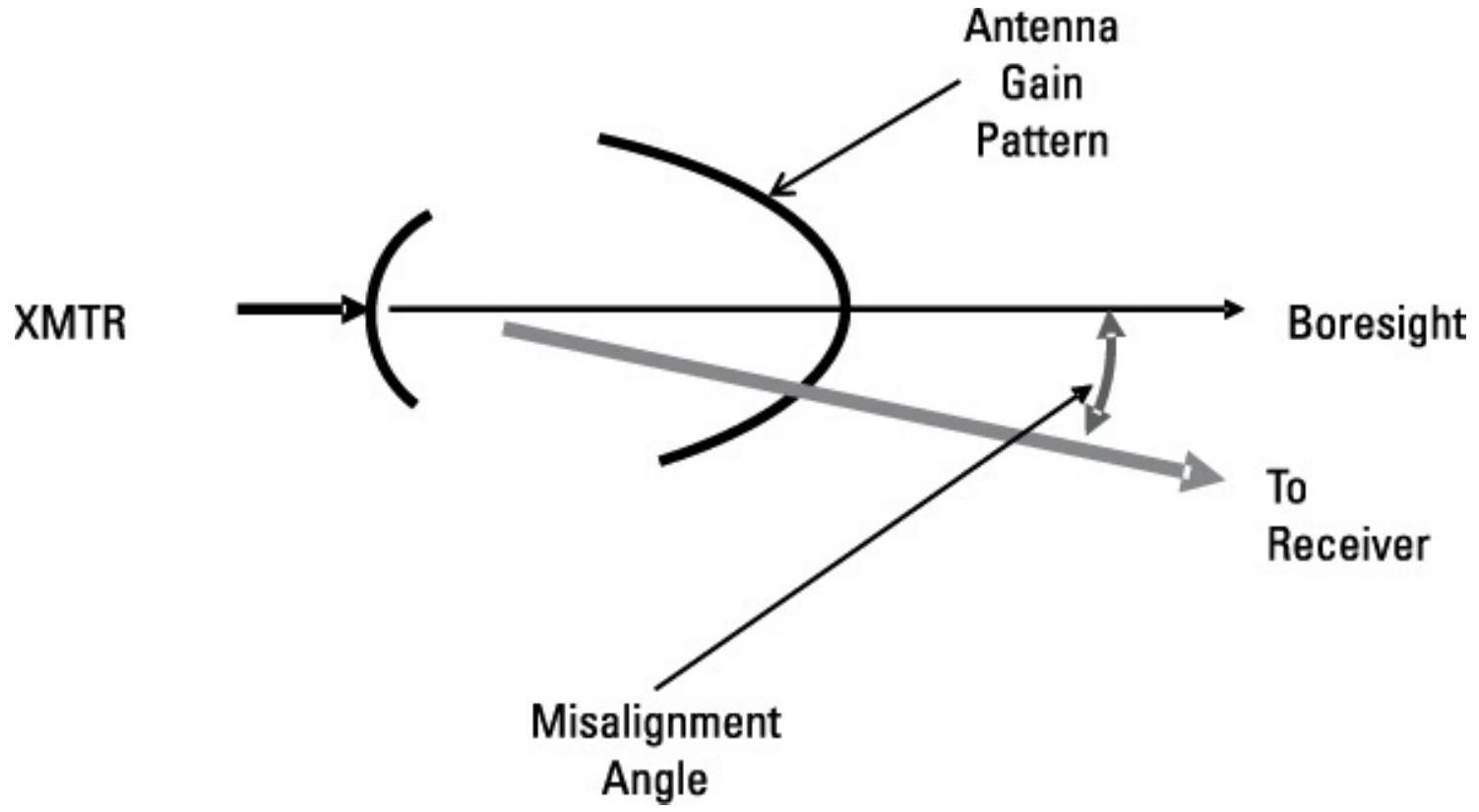 为天线失准指定链路预算损耗的最准确方法是从制造商处获取天线增益图,并读取相对于波束中心增益的损耗值,该角度等于规定的指向精度。这仍然是一个好方法,但同时也很方便有一个理想抛物面天线的公式,用于估算失准角带来的损耗。以下公式给出了\(3-\mathrm{dB}\)波束宽度与波长和天线口径的关系: