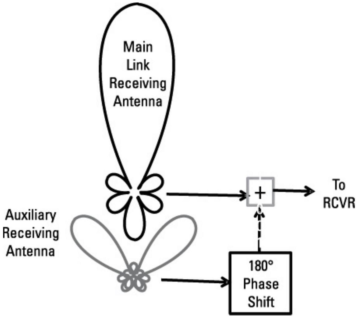 如图5.30所示,旁瓣抵消器使用一副在旁瓣方向有增益的天线。若该天线接收到的信号强于常规链路天线接收到的信号,则在接收链路信号中加入一个相位反转副本,从而抵消(或显著降低)干扰信号。利用相控阵天线在特定方向产生多个零陷,也能实现干扰信号的抑制。
