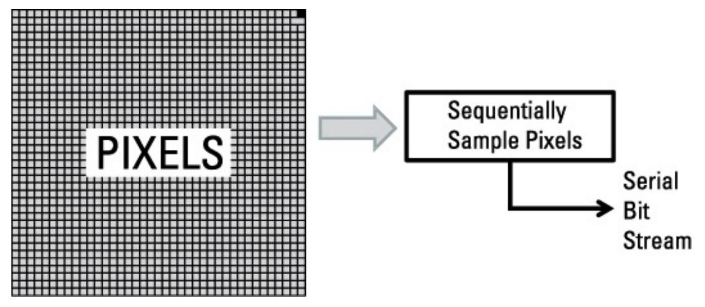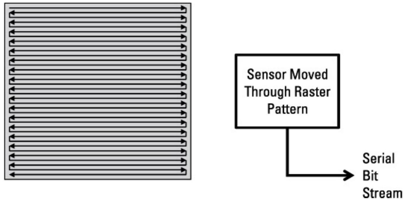 图5.31 使用光栅扫描获取图像时,每个像素的颜色强度被数字化为一个串行比特流。