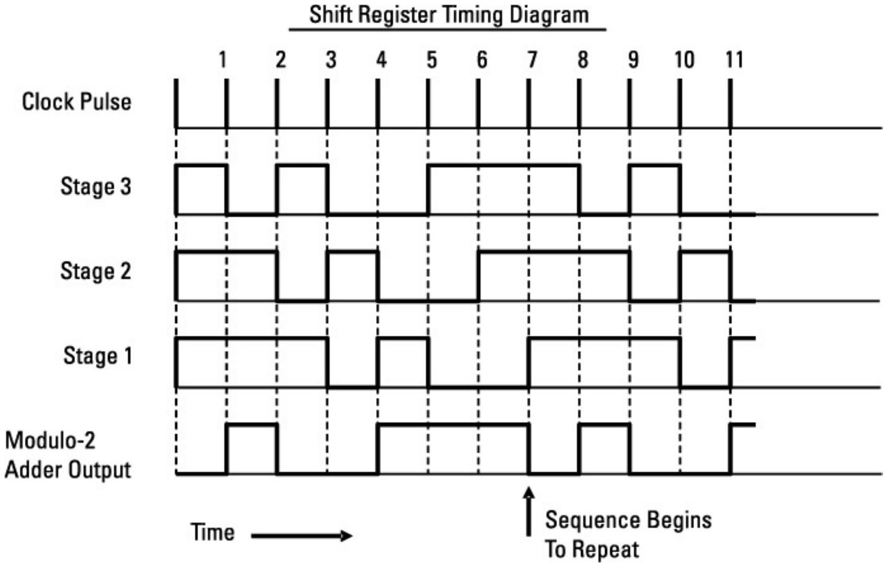 - 在重复前包含\(2^n-1\)比特,其中\(n\)是生成码所需的移位寄存器数;