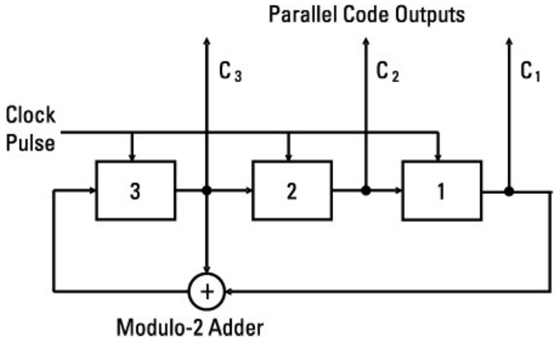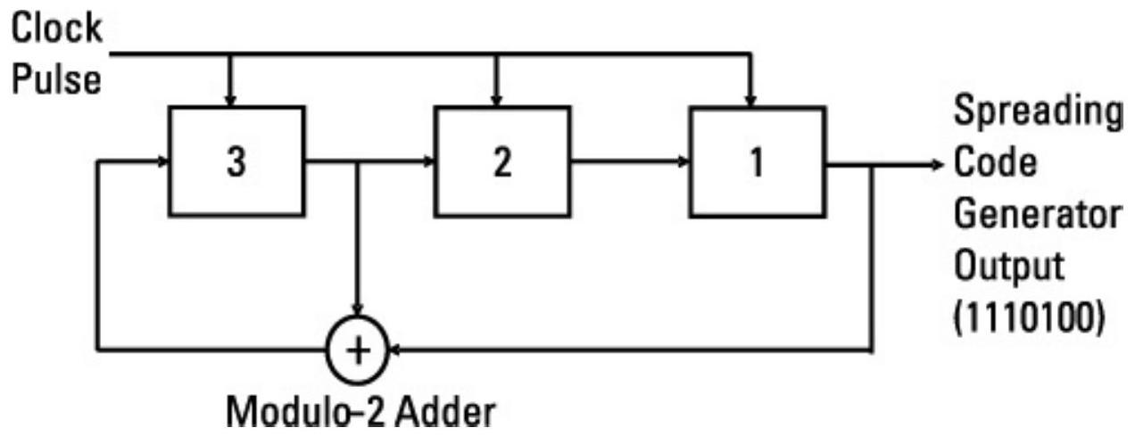 在操作开始时,图5.33中的所有移位寄存器均置为1。图5.34展示了随时钟周期变化的各移位寄存器状态。该码在7个周期后重复。每个时钟周期后,第3级状态移到第2级,第1级与第3级的二进制和输入到第3级。在此过程中,不进位,即\(1+1=0\),不会向下一寄存器进位。