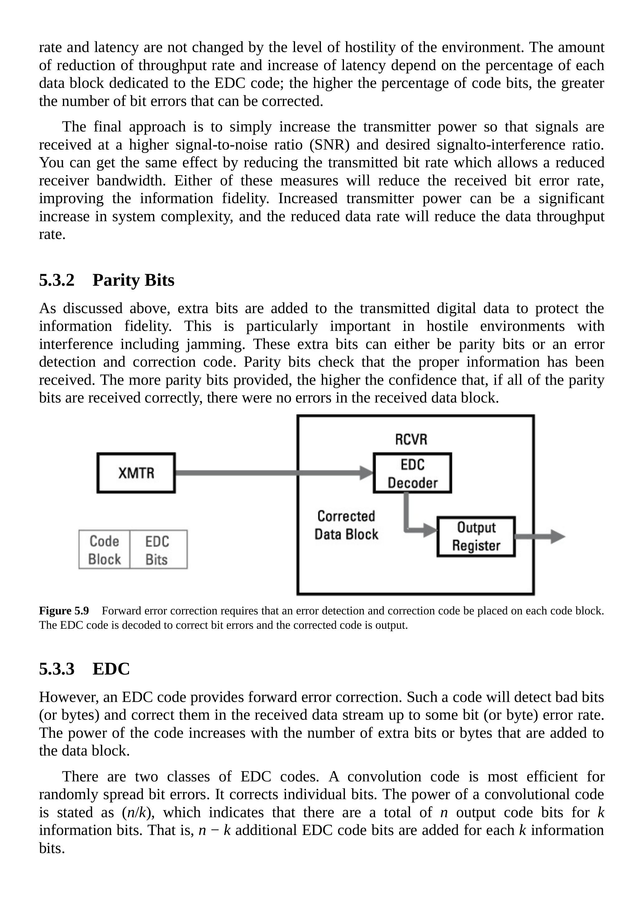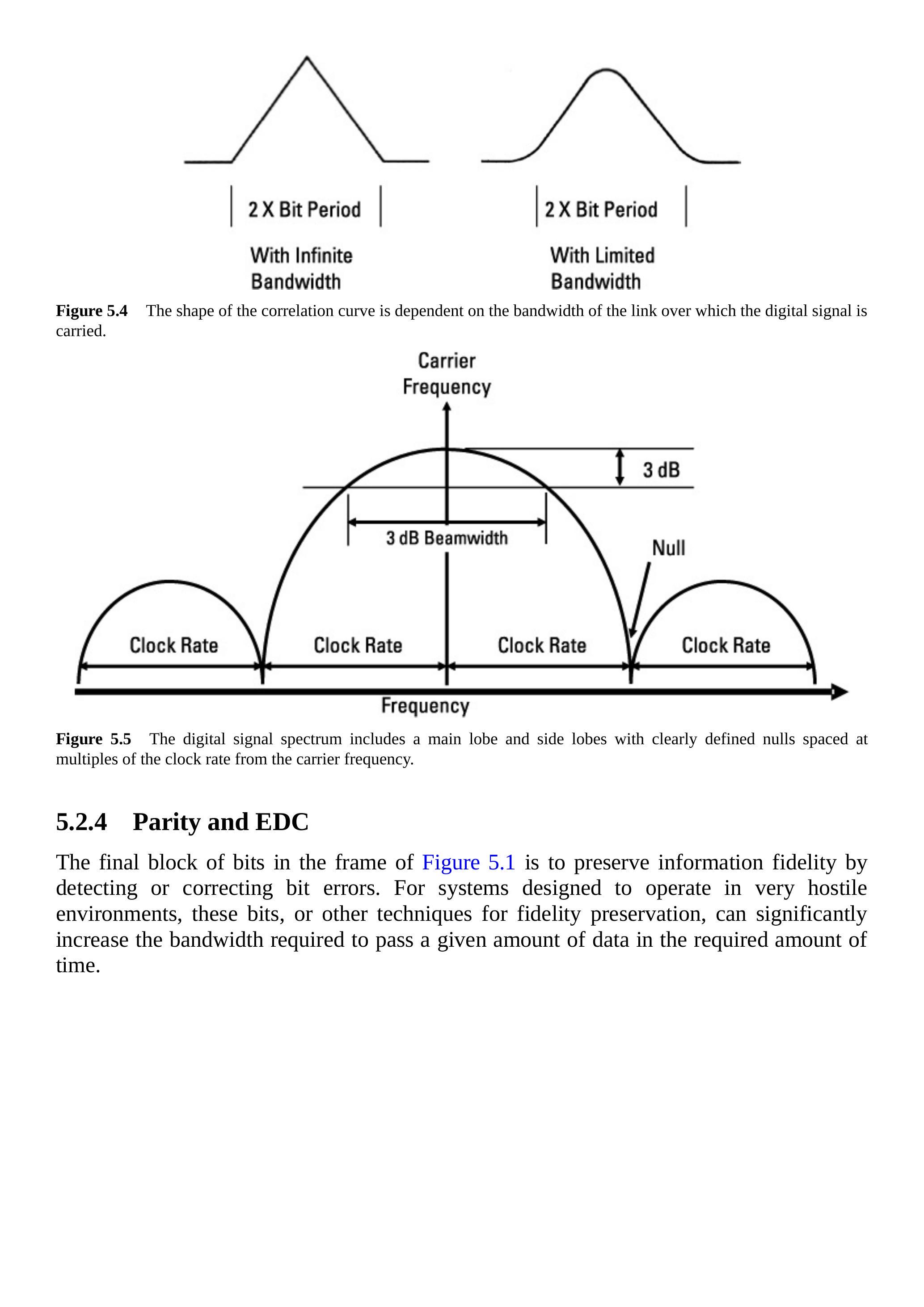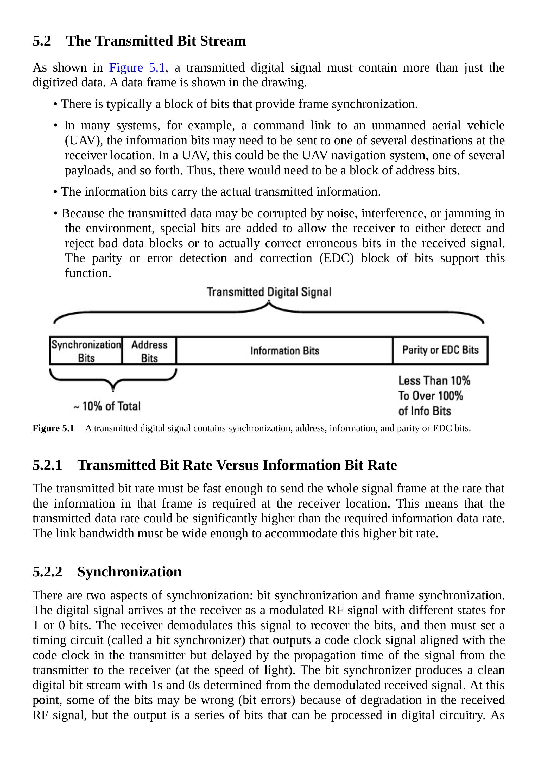 图5.1帧中的最后一个比特块用于保持信息保真度,通过检测或纠正比特错误来实现。对于设计在高度敌对环境下运行的系统,这些比特或其他保真度保持技术可能会显著增加在规定时间内传递一定数据所需的带宽。