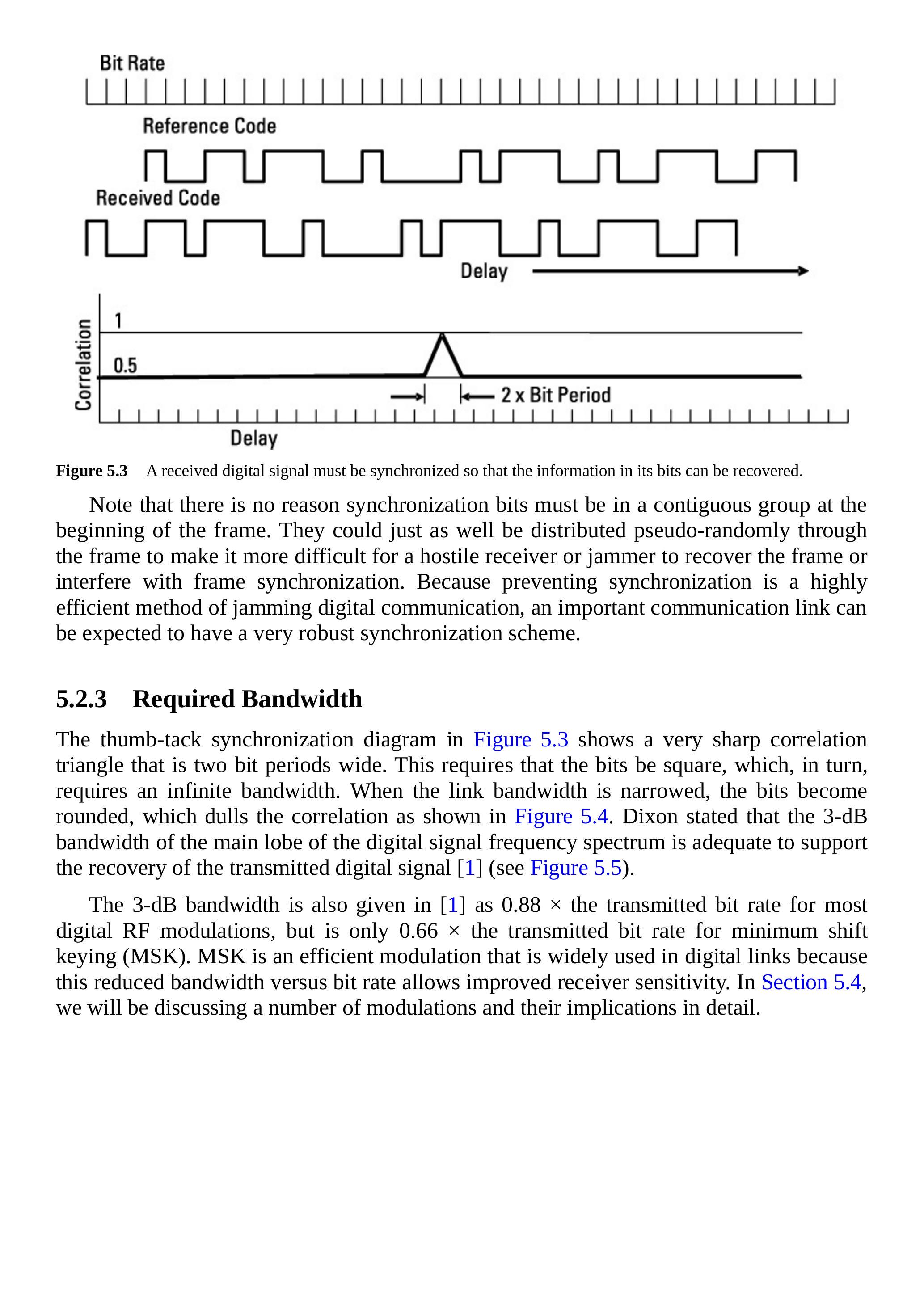 图5.3中的图钉式同步图显示了一个宽度为两个比特周期的非常尖锐的相关三角。这要求比特为方波,这反过来需要无限带宽。当链路带宽变窄时,比特变为圆滑的波形,从而削弱相关性,如图5.4所示。Dixon指出,数字信号频谱主瓣的\(3-\mathrm{dB}\)带宽足以支持恢复传输的数字信号[1](见图5.5)。