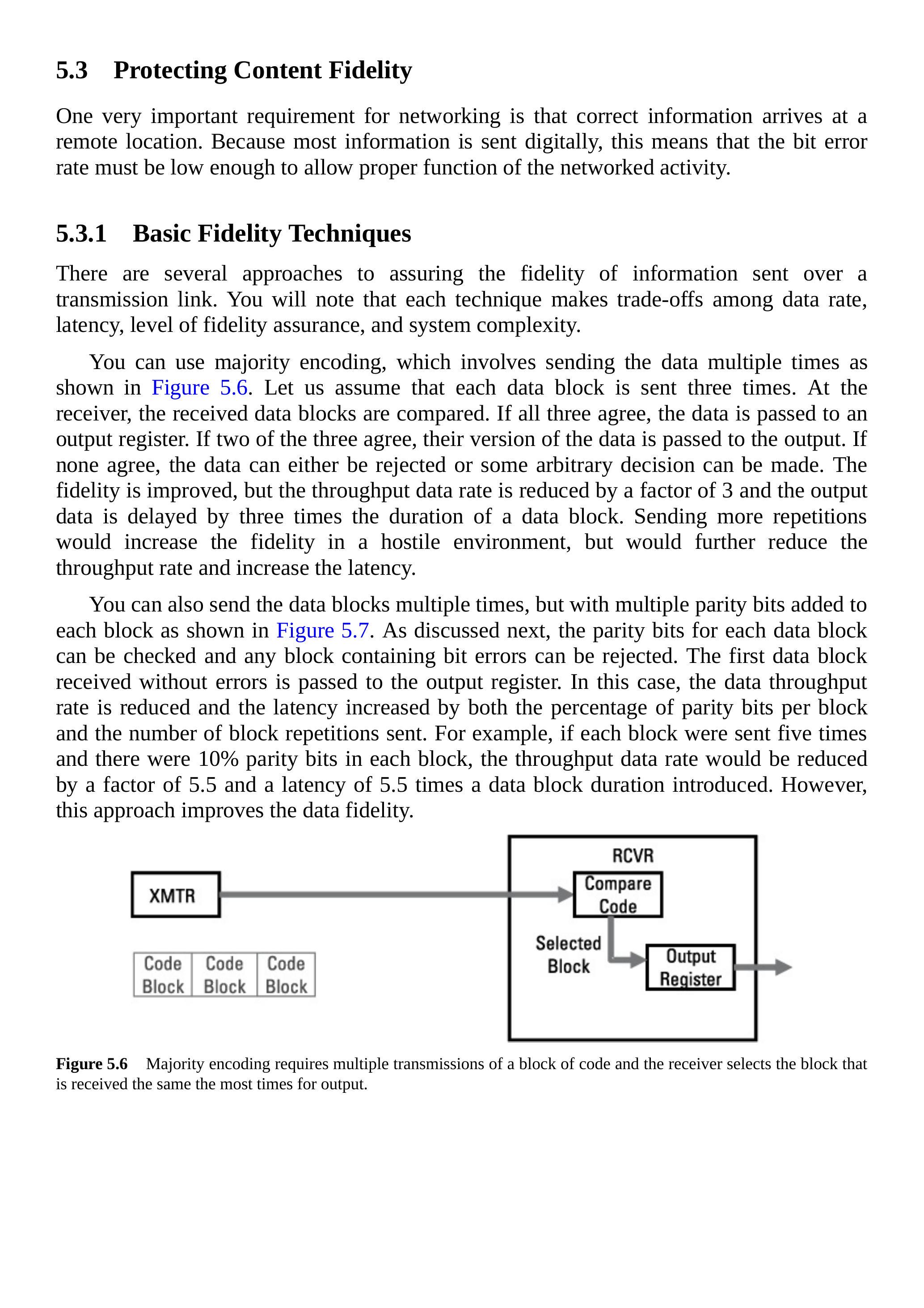 可以使用多数编码(majority encoding),即多次发送同一数据,如图5.6所示。假设每个数据块发送三次。在接收端,对接收的数据块进行比较。如果三次均一致,则数据传递到输出寄存器;如果三次中有两次一致,则以这两次的数据为准输出;如果三次均不一致,则数据要么被丢弃,要么作任意决定。这样可以提升保真度,但吞吐数据率降低为原来的三分之一,且输出数据延迟为数据块时长的三倍。在敌对环境中,增加重复次数会进一步提升保真度,但也会进一步降低吞吐率并增加时延。