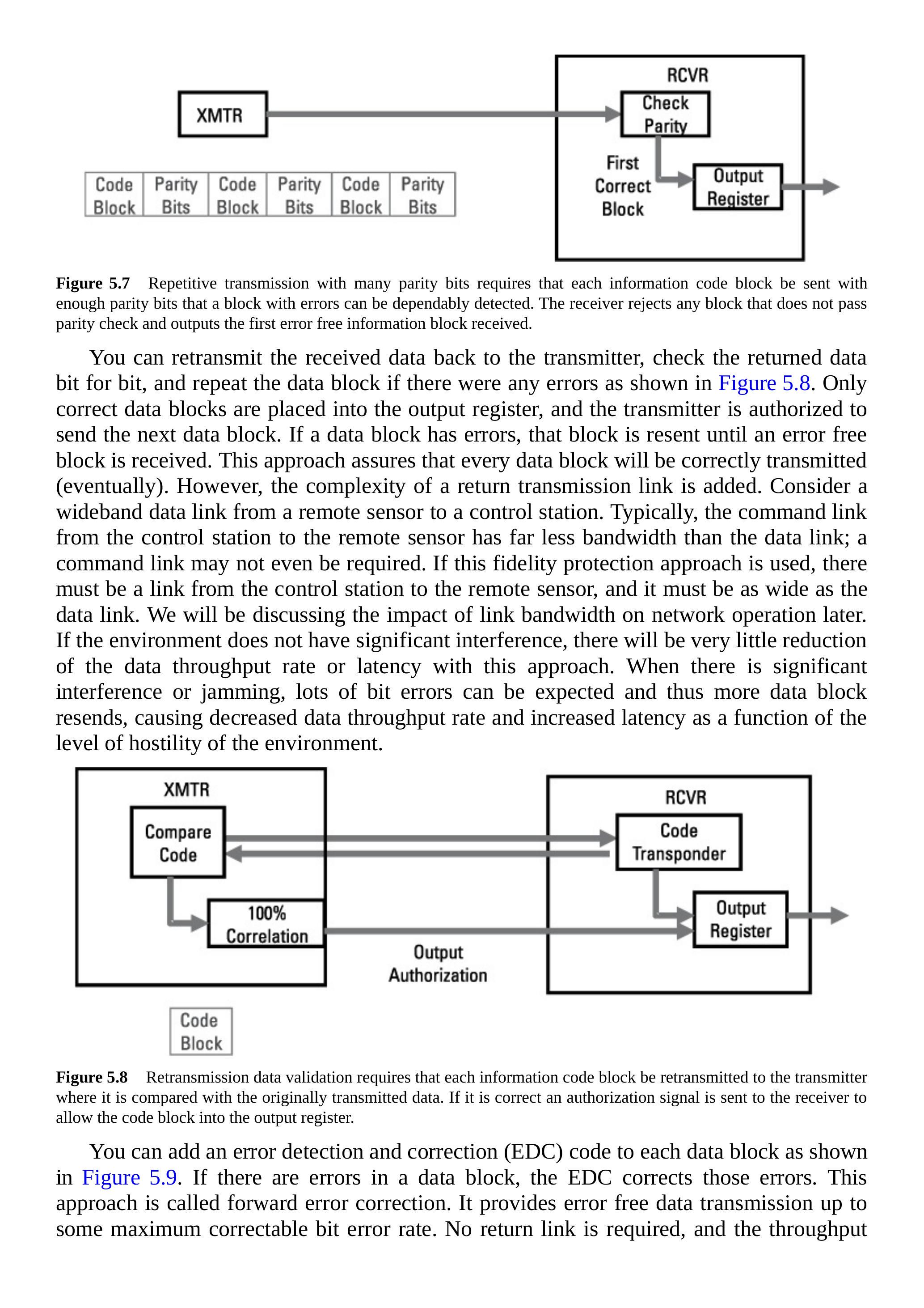 你也可以多次发送数据块,但每个块附加多个奇偶校验比特,如图5.7所示。如上文所述,每个数据块的奇偶校验比特可以被检查,任何包含比特错误的块将被丢弃。第一个无错误接收的数据块被传递到输出寄存器。在这种情况下,数据吞吐率和时延既取决于每个块中奇偶校验比特所占比例,也取决于发送的重复次数。例如,如果每个块发送五次,且每个块中含有\(10 \%\)奇偶校验比特,则吞吐数据率降低为原来的1/5.5,且时延为数据块时长的5.5倍。但这种方法提高了数据保真度。