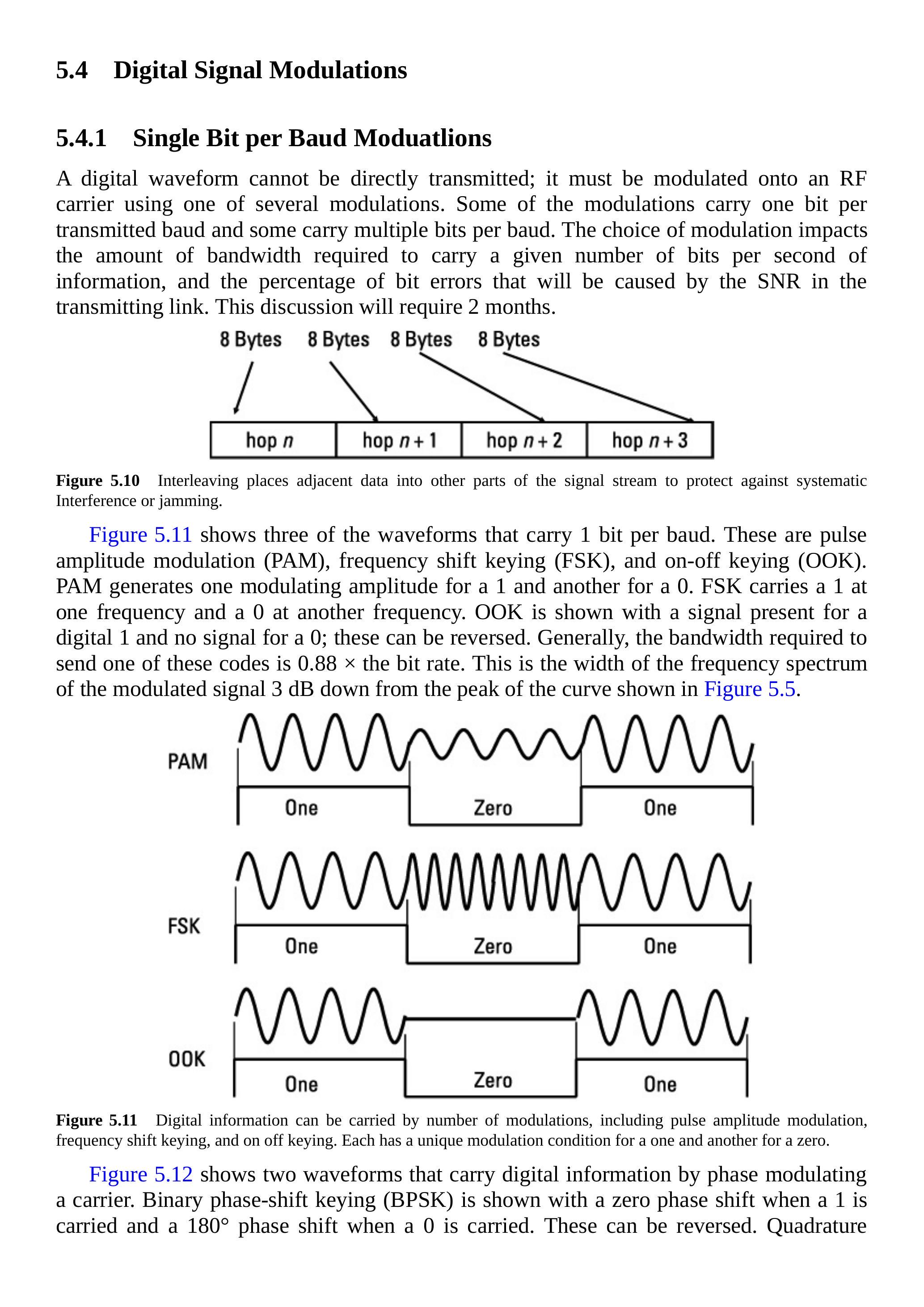 数字波形不能直接传输;必须将其通过某种调制方式调制到RF载波上。一些调制方式每个传输的波特携带1个比特,而另一些则在每个波特中携带多个比特。调制方式的选择会影响在传输每秒一定数量比特时所需的带宽,以及传输链路信噪比(SNR)导致的比特错误率百分比。本节的讨论大约需要两个月。