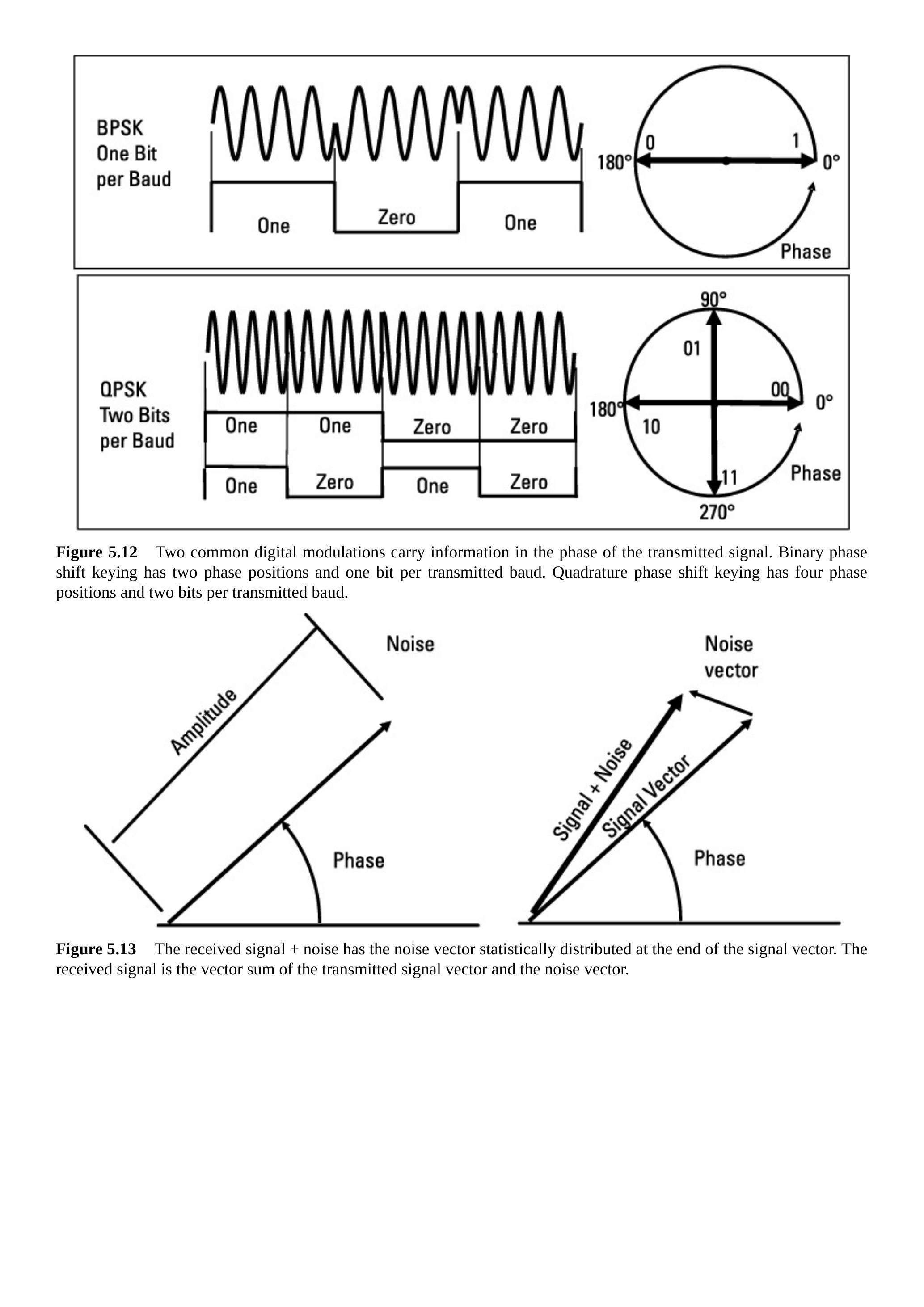 图5.12 两种常见的数字调制通过调制发射信号的相位来传输信息。BPSK有两个相位位置,每波特1比特;QPSK有四个相位位置,每波特2比特。