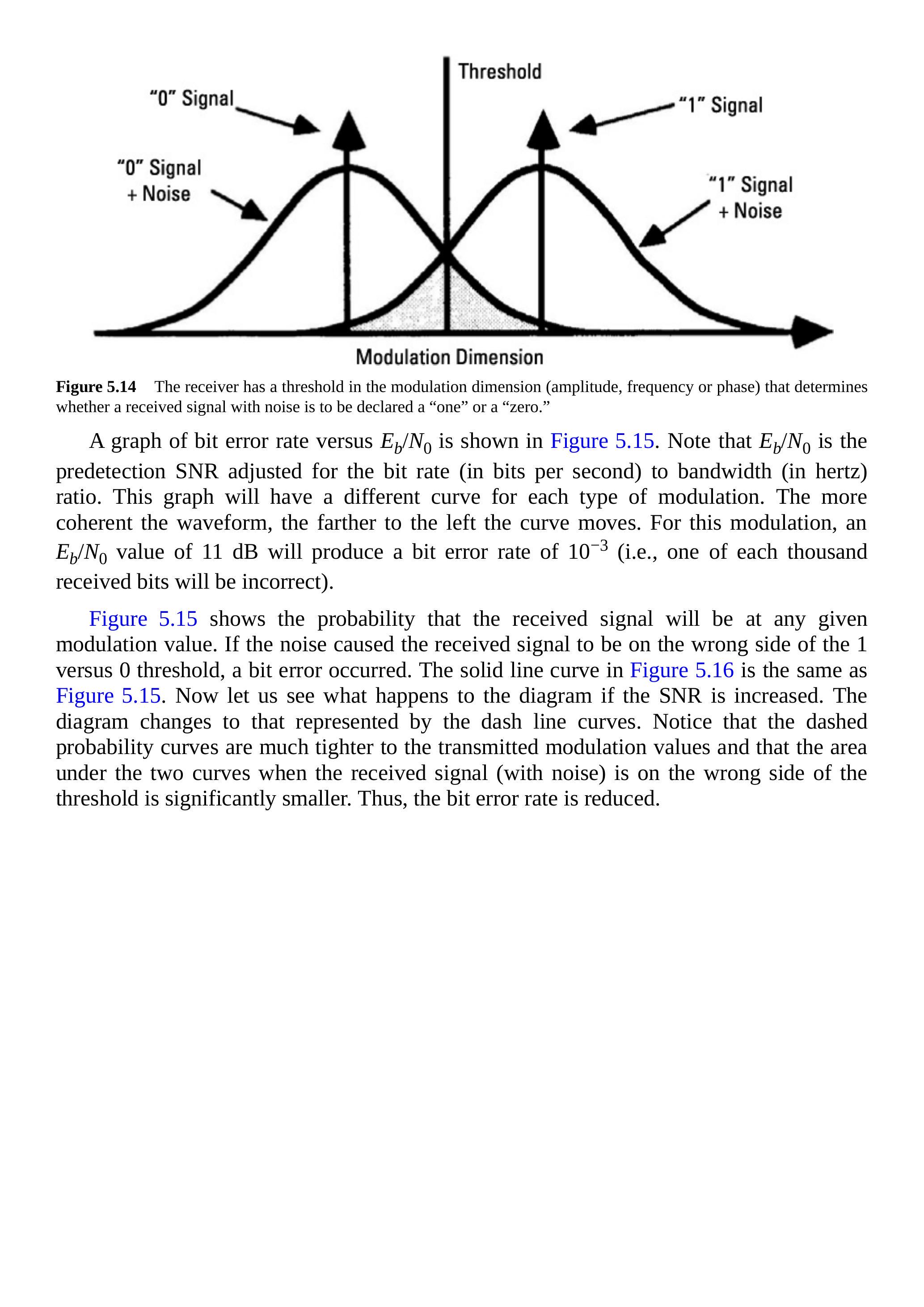 图5.14 接收机在调制维度(幅度、频率或相位)上设置阈值,以判定带噪声的接收信号是“1”还是“0”。