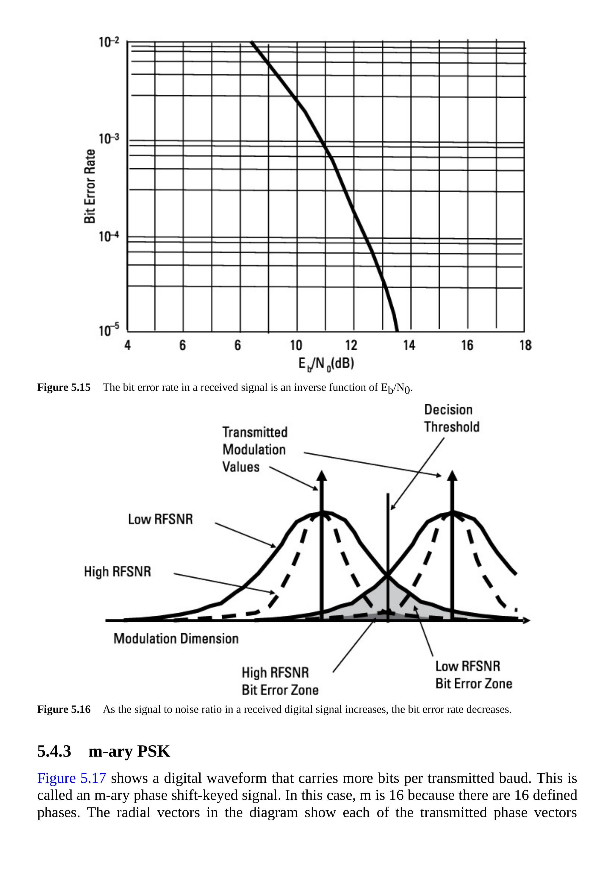 图5.17展示了每个波特携带多个比特的数字波形。这称为m进制相移键控信号。本例中\(m=16\),因为有16个定义相位。图中的径向矢量表示各个发射相位(无噪声时)。每个相位代表4个比特信息。这是一种高效调制方式,因为每个波特传输4比特。因此,传输所需带宽仅为5.3.1节中讨论的调制方式所需带宽的四分之一。图示的16进制PSK需要比BPSK高约7.5 dB的前检测SNR才能达到相同比特错误率。这是因为接收信号的相位噪声会使矢量偏离原始相位。相位角越接近,越易受噪声影响,因此要求更高的SNR以维持相同比特错误率。