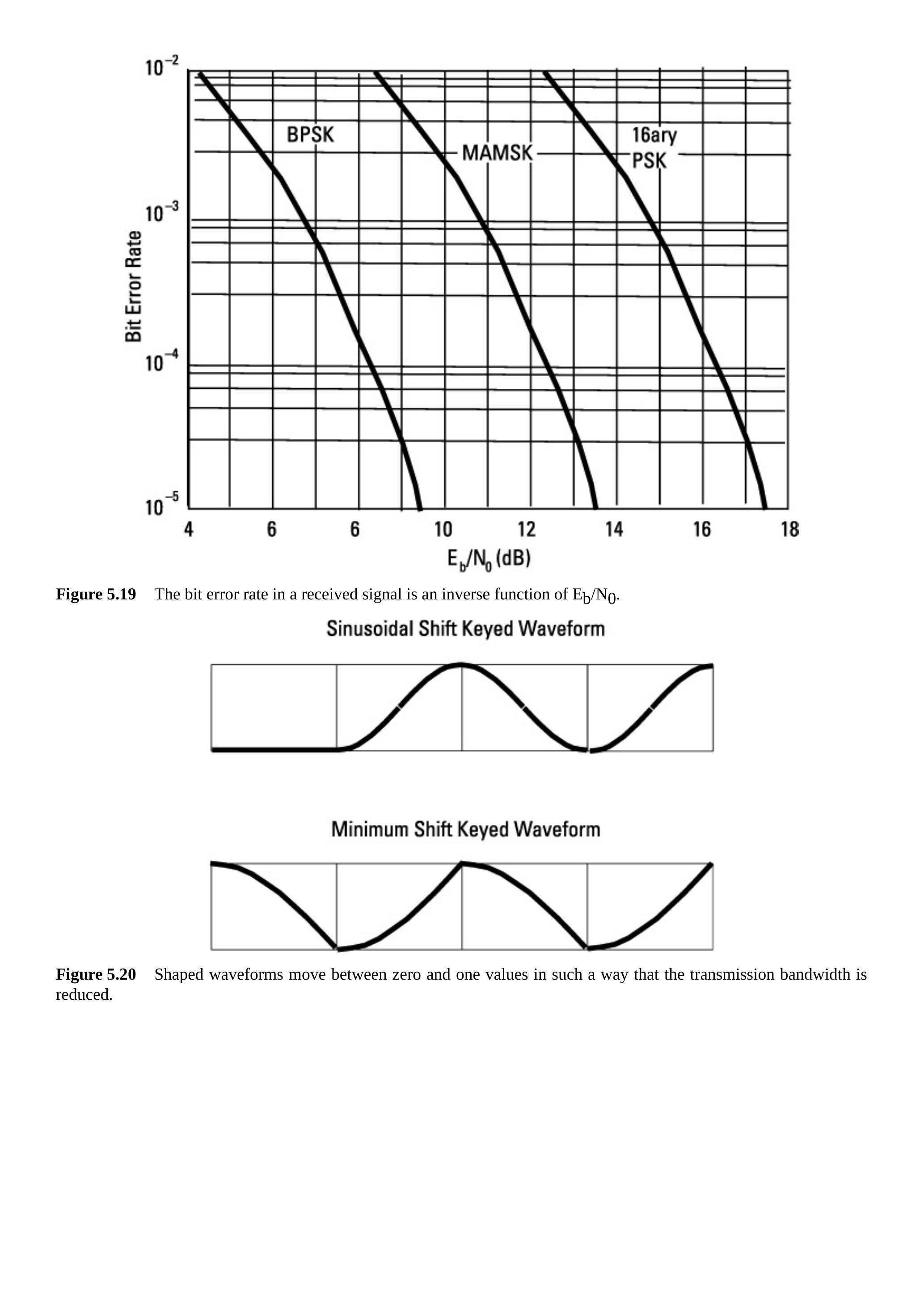 图5.19直接比较了三种调制的比特错误率与\(E_{b}/N_{0}\)关系。最左曲线为每波特传输1比特的调制方式,中间曲线为在0与1调制值之间特别高效转换的波形,最右曲线为每波特传输多个比特的调制方式。三条曲线形状相同,但水平方向位置不同。需要注意,这些调制传输信息所需的带宽也不同。左曲线频谱效率最低,右曲线最高。