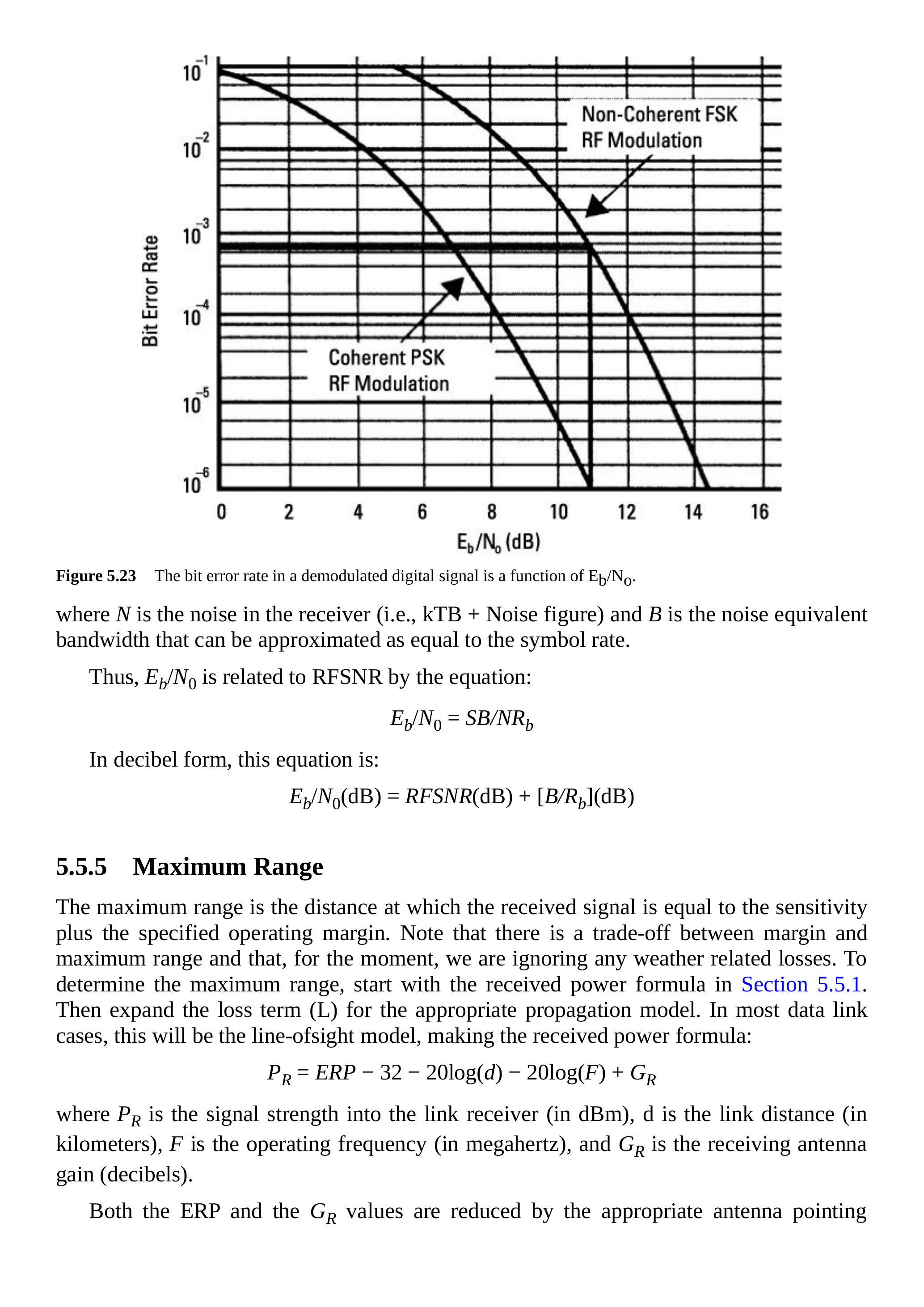 图5.15展示了比特错误率与\(E_{b}/N_{0}\)的关系。\(E_{b}/N_{0}\)是前检测SNR经比特率(比特/秒)与带宽(Hz)比值调整后的结果。不同调制方式曲线不同。波形越相干,曲线越左移。对于某种调制,当\(E_{b}/N_{0}=11\ \mathrm{dB}\)时,比特错误率为\(10^{-3}\)(即每千个比特中有1个错误)。