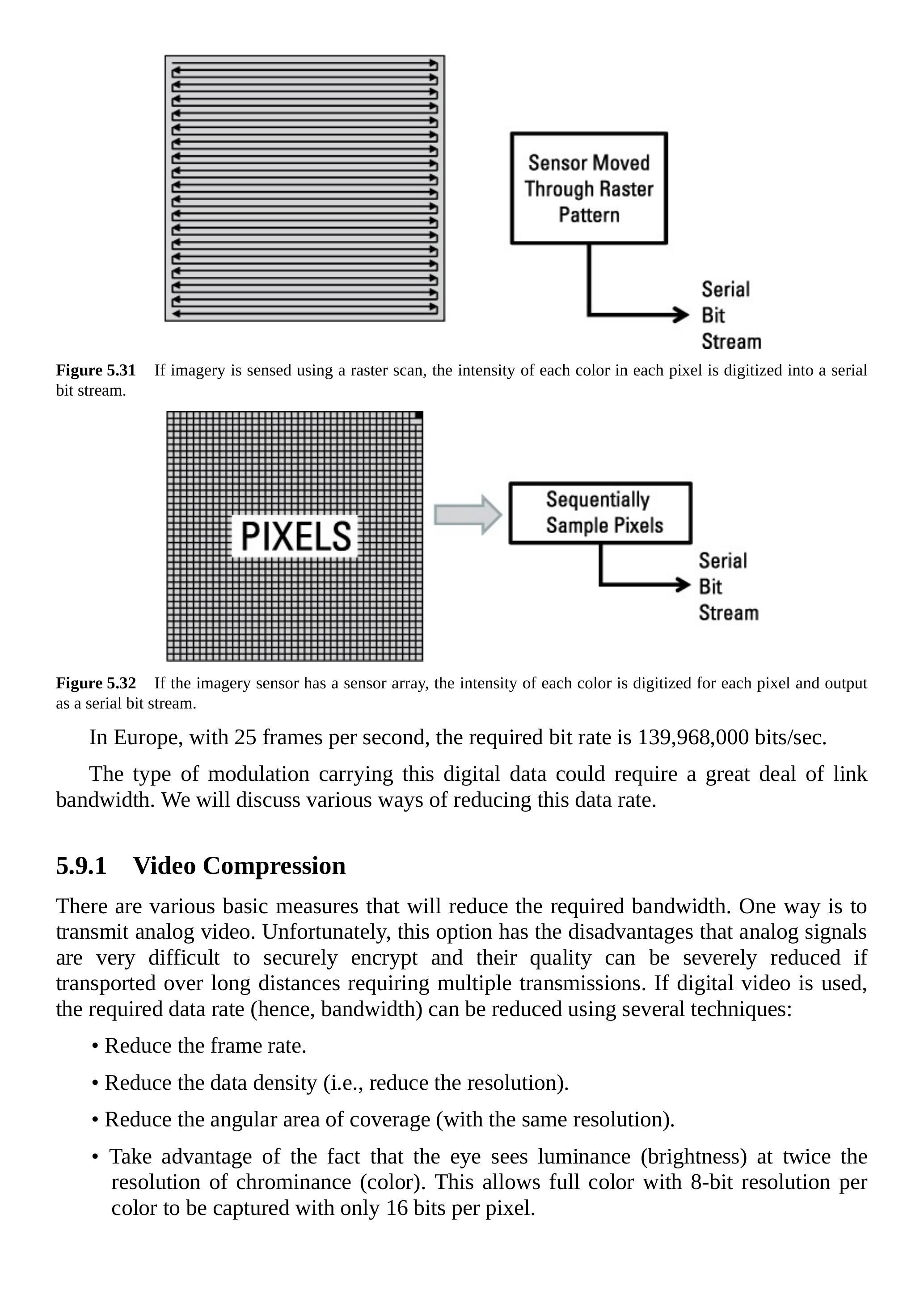 图5.32展示了捕获图像数据的另一种方法。在这种情况下,使用一个传感器阵列。每个传感器捕获图像中的一个像素。传感器的输出依次被采样并数字化,形成适合传输的串行数字信号。