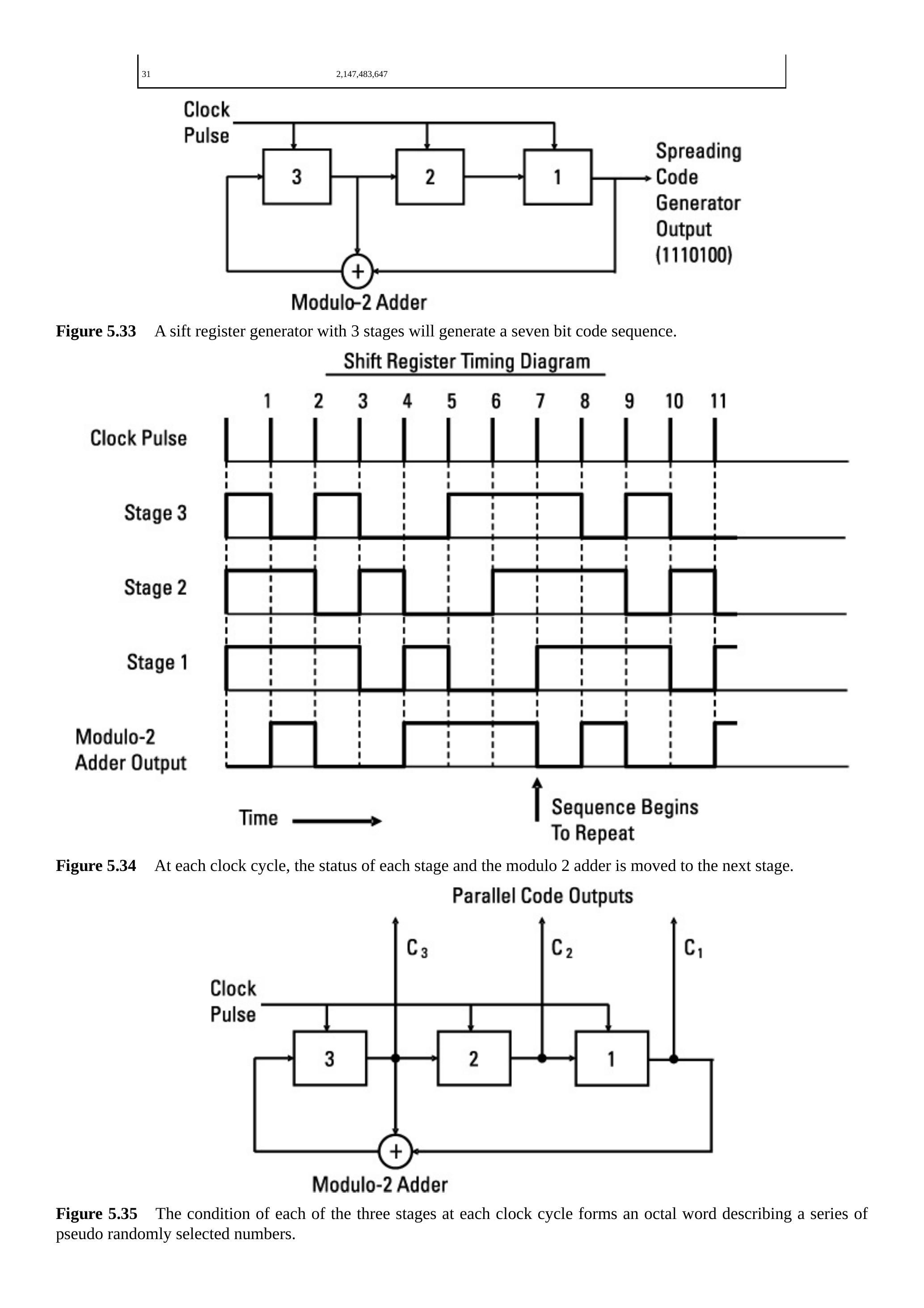 现在看图5.35,其中展示了三级寄存器的状态。这三个比特构成一个八进制二进制数。注意在表的右列,前七个时钟周期(在第一级输出1110100码)形成的八进制比特生成了1到7之间的随机数序列。这一系列八进制码可用于设置跳频无线电合成器的倒计时值,从而实现伪随机跳频。