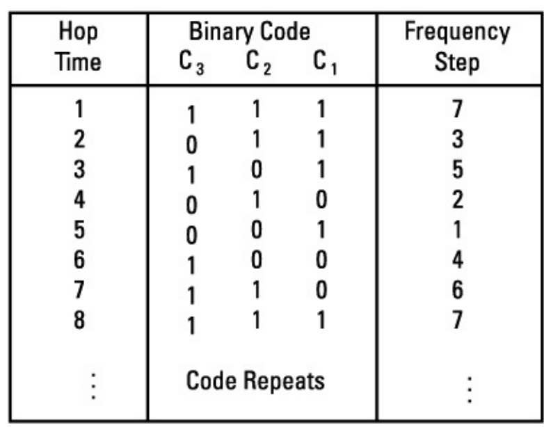 | 跳频时刻 | 二进制码 \(\mathrm{C}_{3} \mathrm{C}_{2} \mathrm{C}_{1}\) | 频率步长 | ||